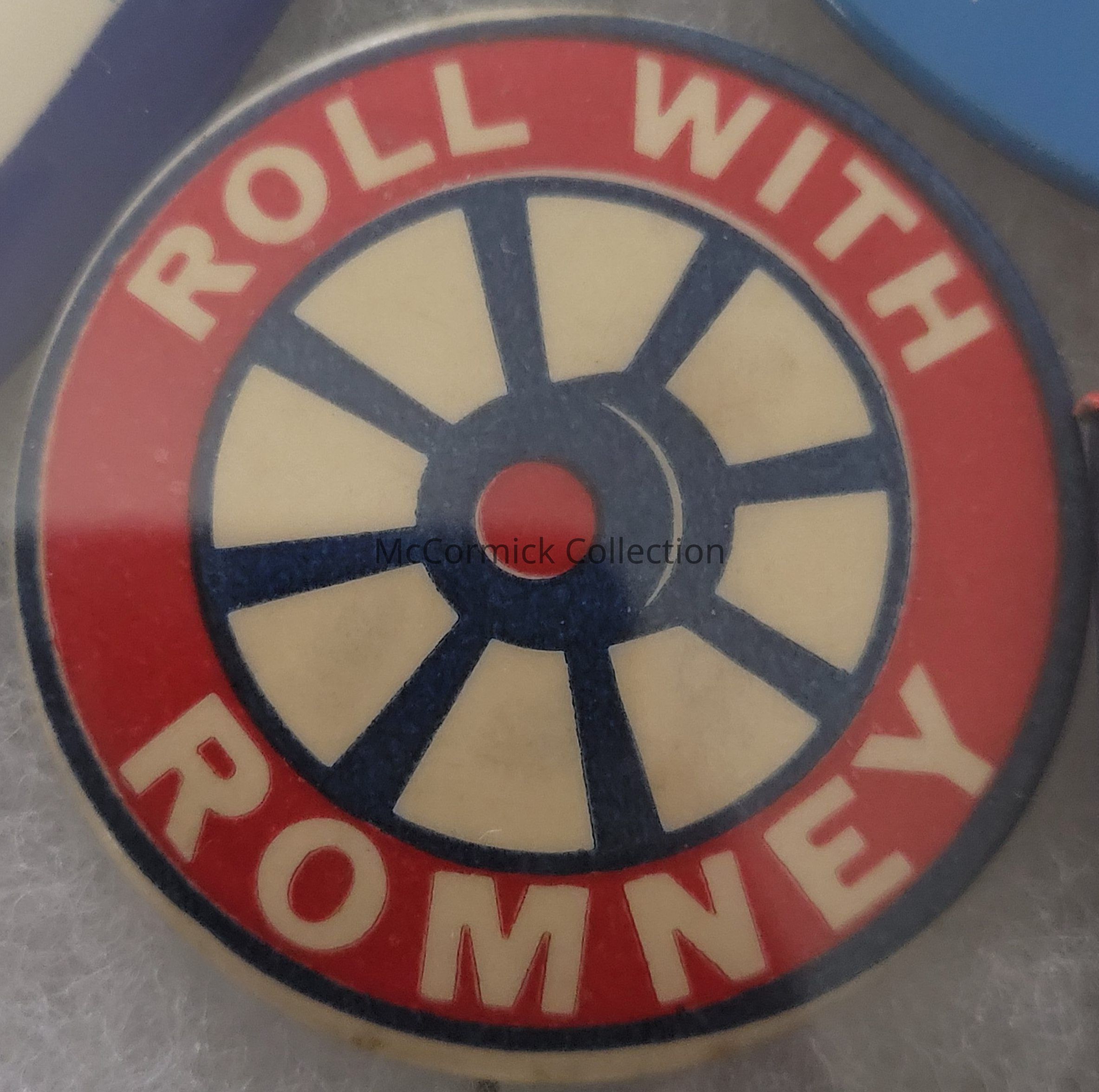 Political button, 1.75". A red, white, and blue wheel with the phrase "Roll with Romney." This was Romney's gubernatorial slogan in the 1960s.