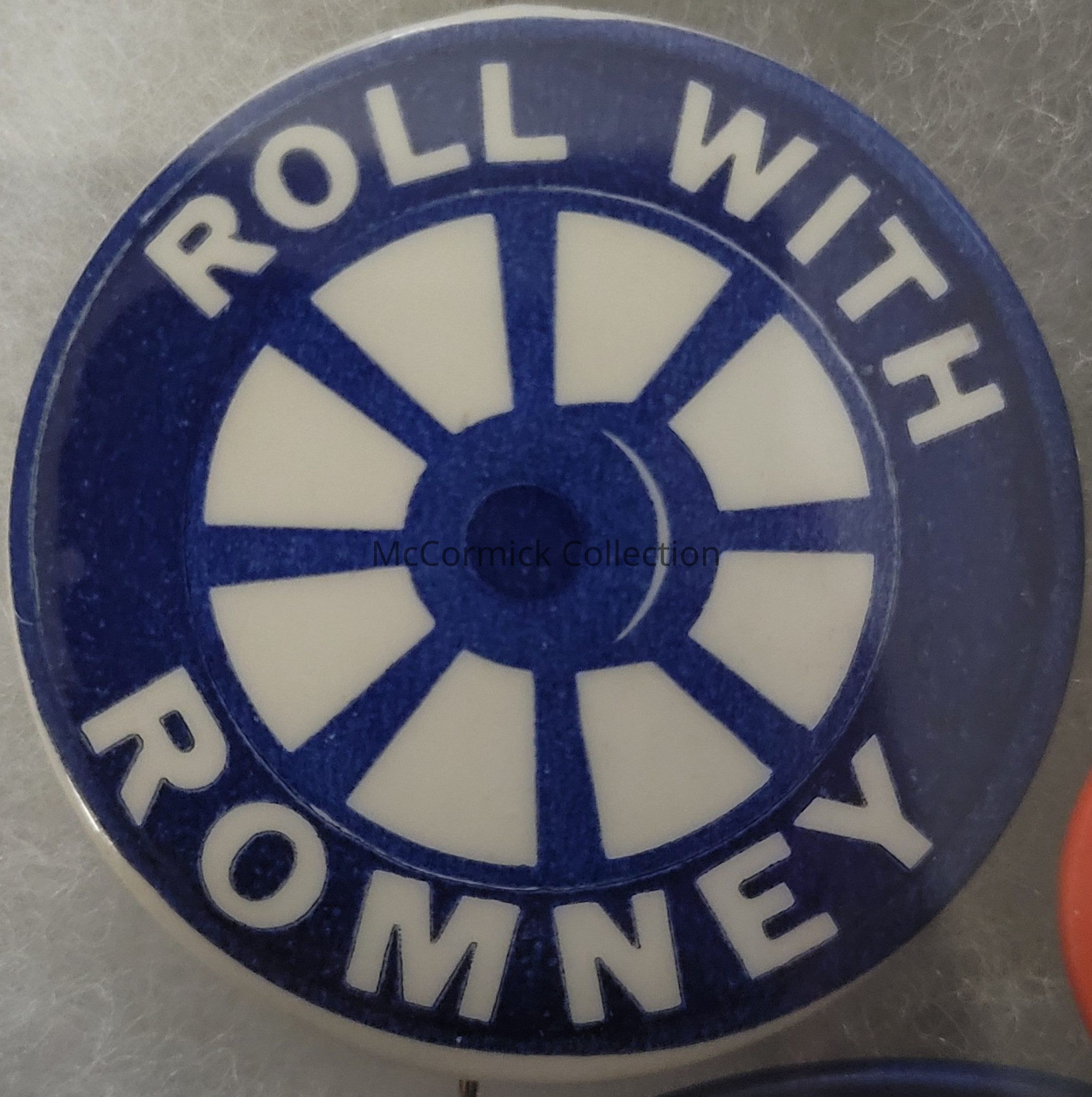 Political button, 1.75". A blue and white wheel with the phrase "Roll with Romney." This was Romney's gubernatorial slogan in the 1960s.