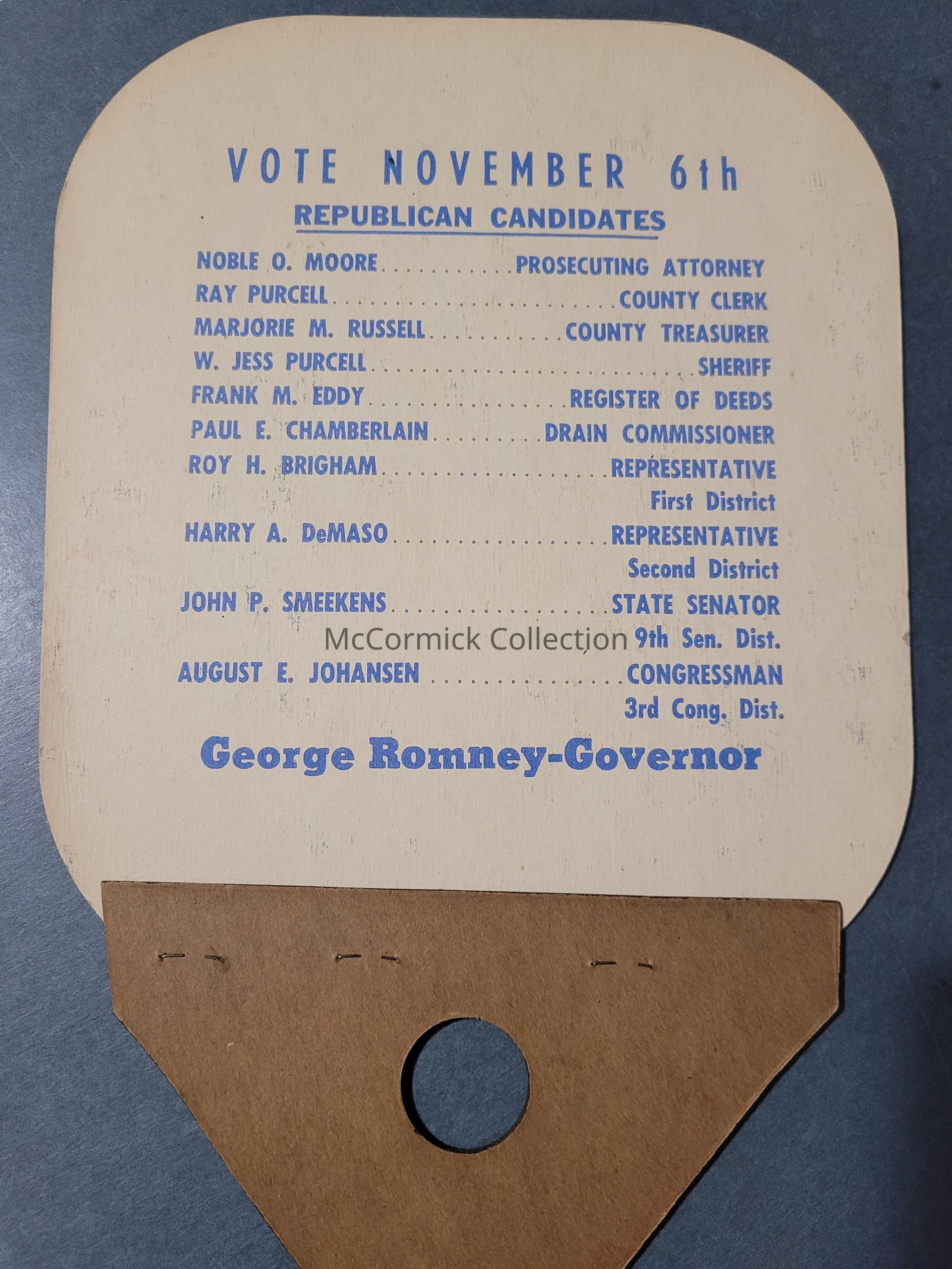 A paper political campaign fan, circa 1960s for George Romney for Governor. Also listed: Noble O. Moore, Ray Purcell, Marjorie M. Russell, W. Jess Purcell, Frank M. Eddy, Paul E. Chamberlain, Roy H. Brigham, Harry A. DeMaso, John P. Smeekens, August E. Johansen.