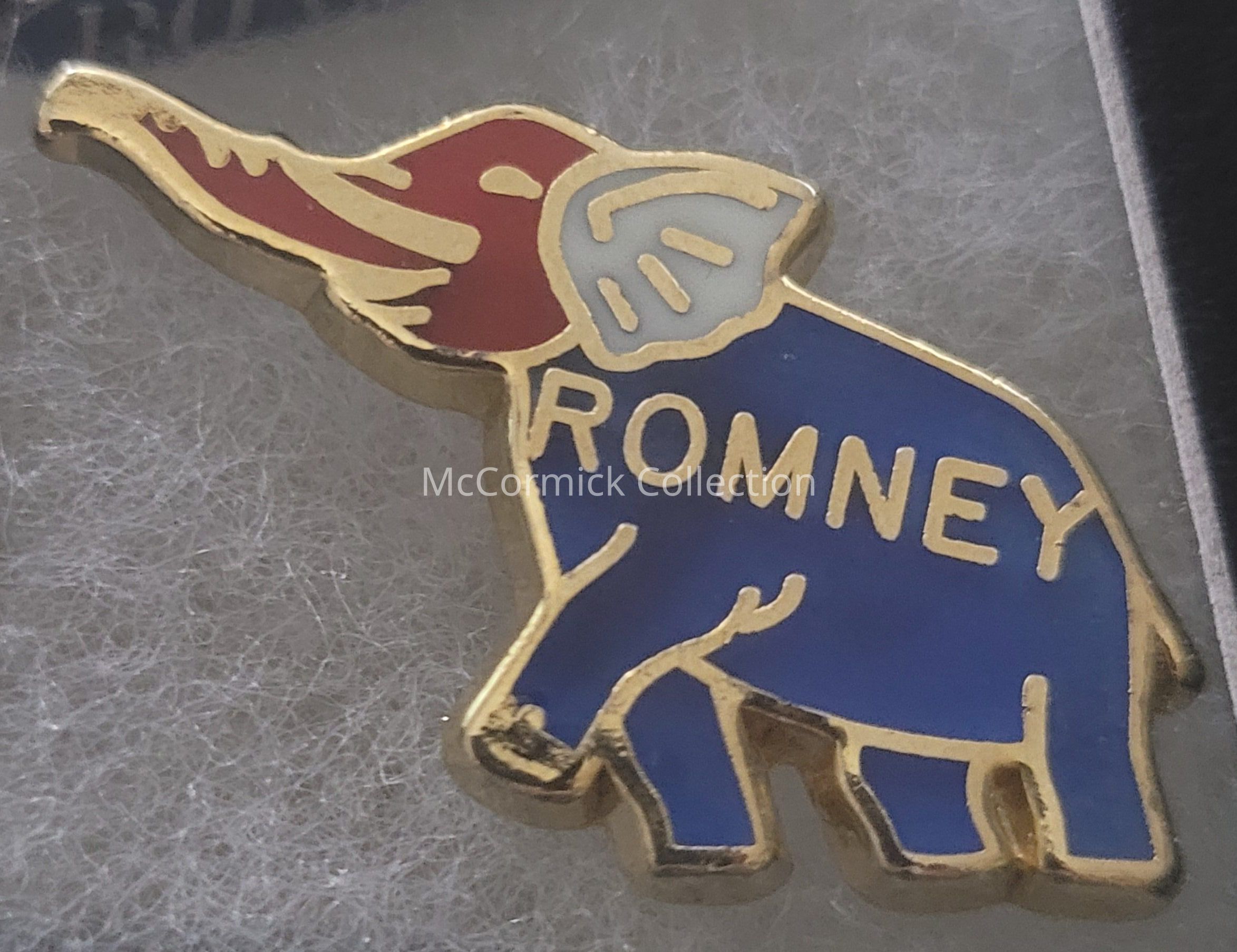 A red, white, blue, and gold enamel elephant pin for George Romney, circa 1960s.
