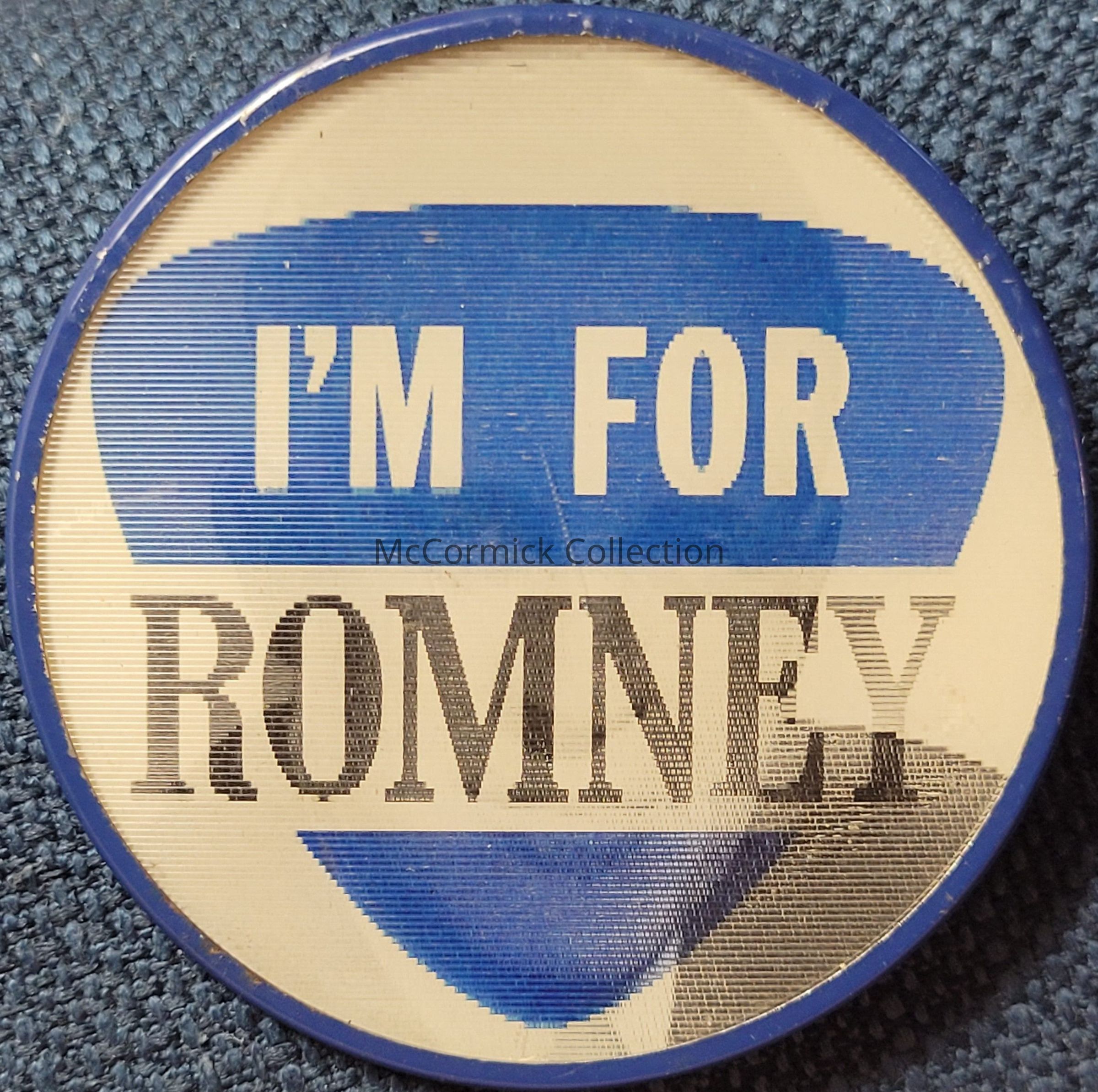 George W. Romney gubernatorial flasher button, 2.5", in the blue shield style reading "I'm for Romney."