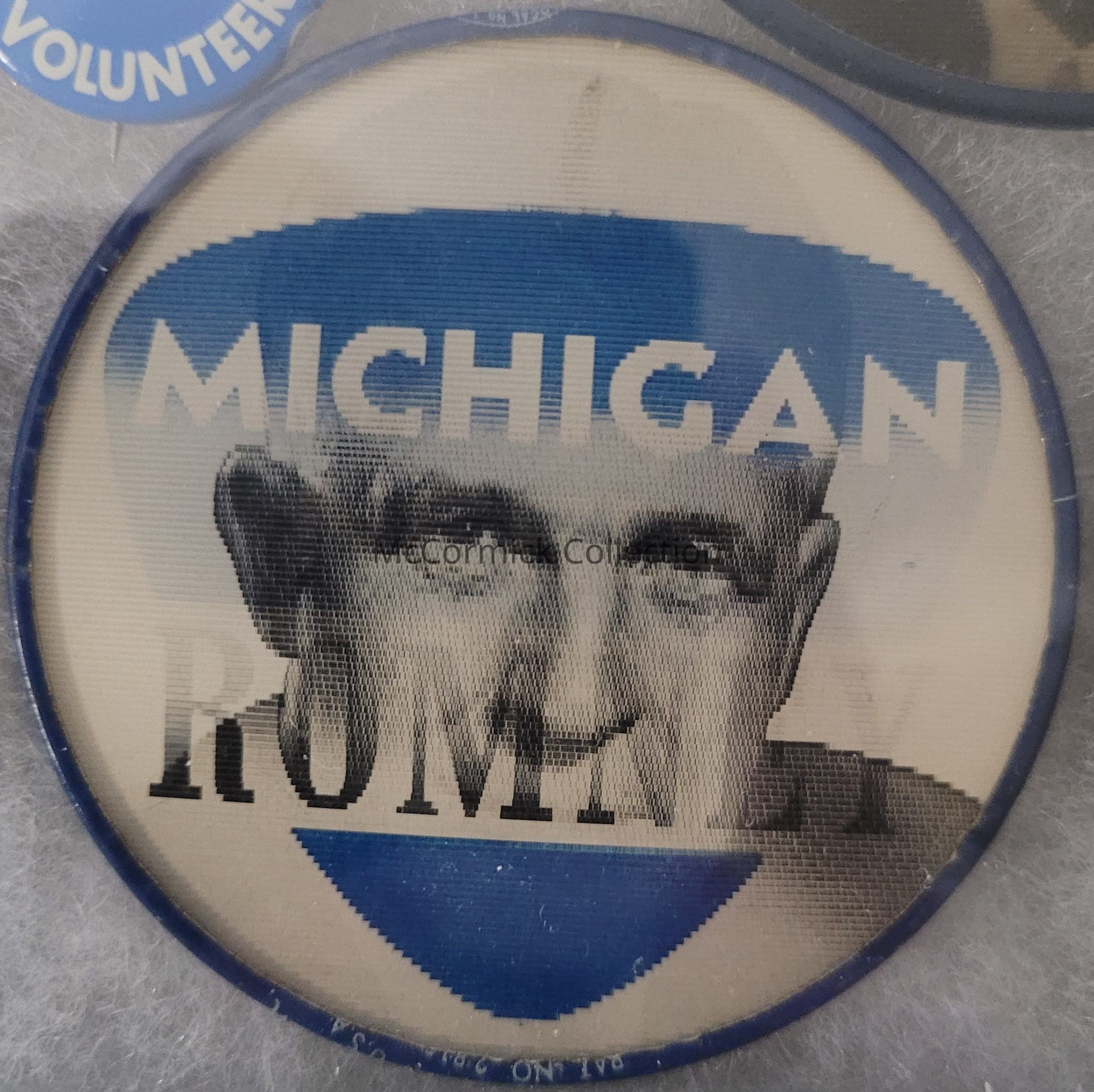 George W. Romney gubernatorial flasher button, 2.5", in the blue shield style reading "Michigan Needs Romney."