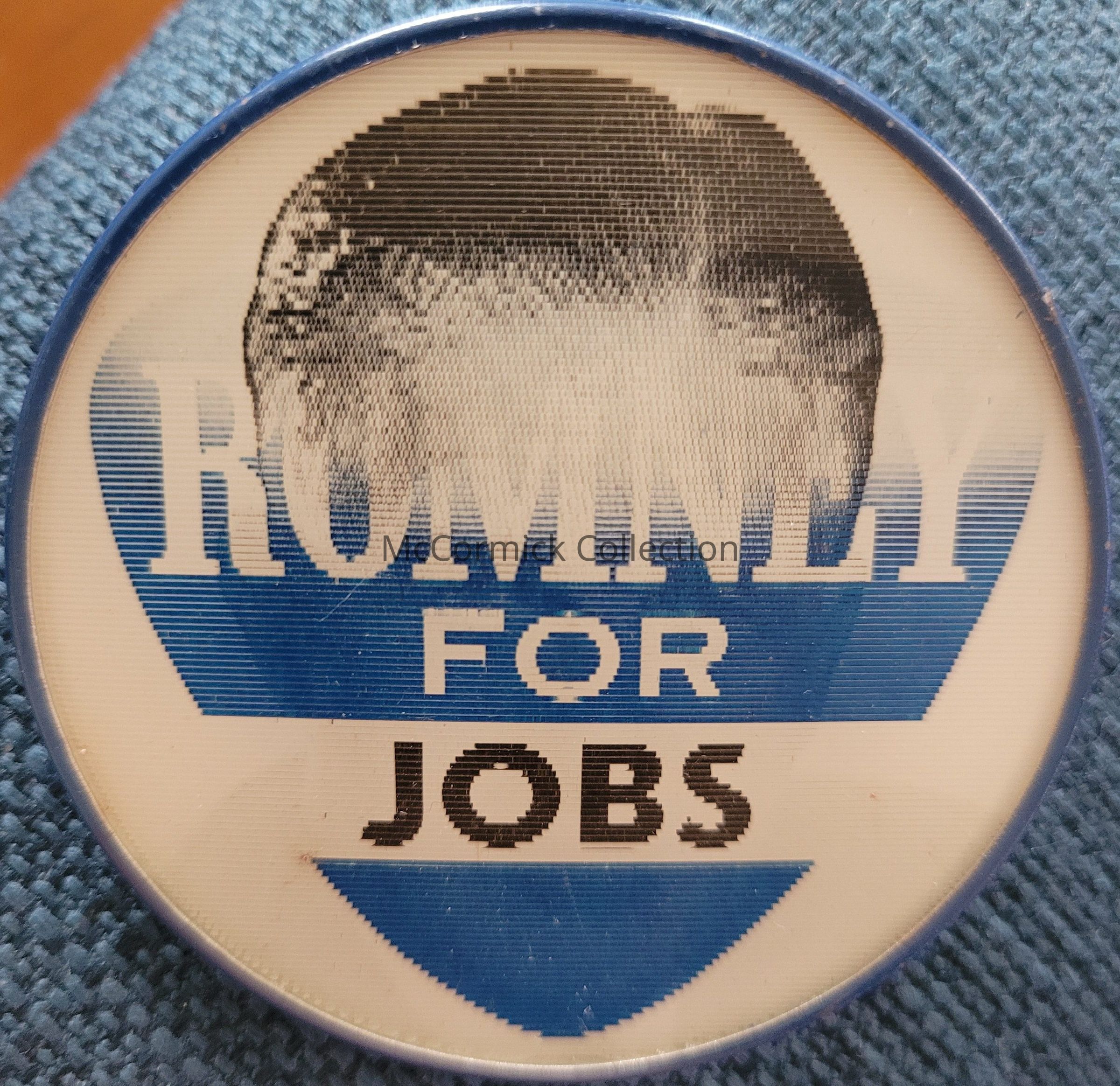 George W. Romney gubernatorial flasher button, 2.5", in the blue shield style reading "Romney for Jobs."
