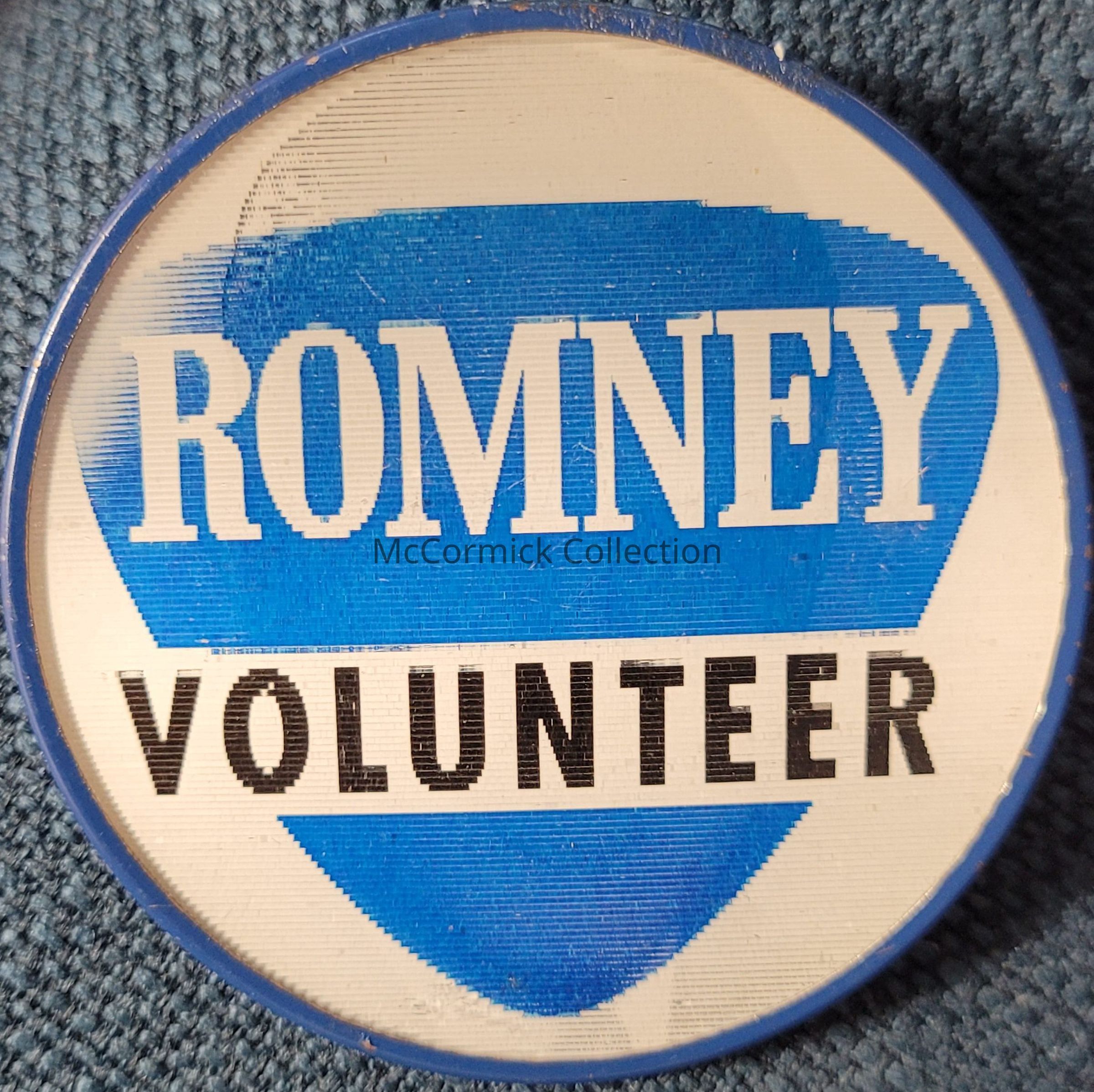 George W. Romney gubernatorial flasher button, 2.5", in the blue shield style reading "Romney Volunteer."
