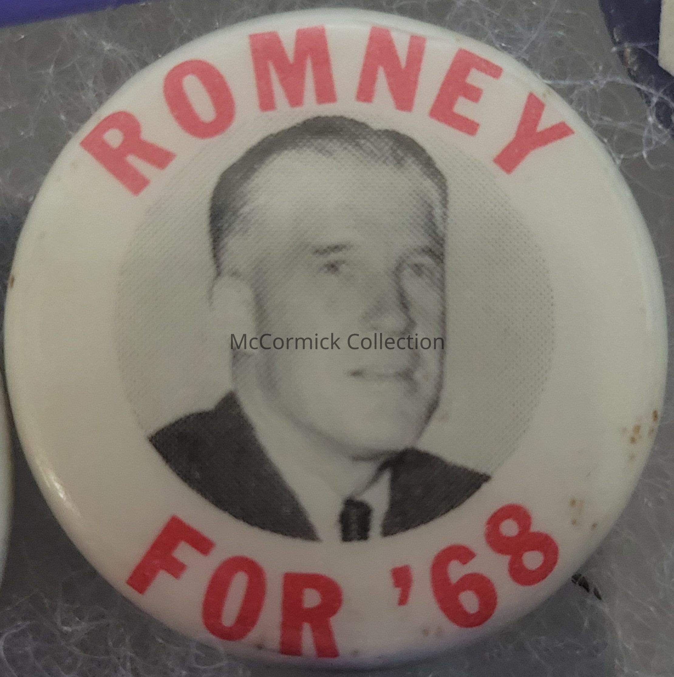 Political button, 1", with a picture of George Romney and the phrase "Romney for '68." It is red, black, and white.