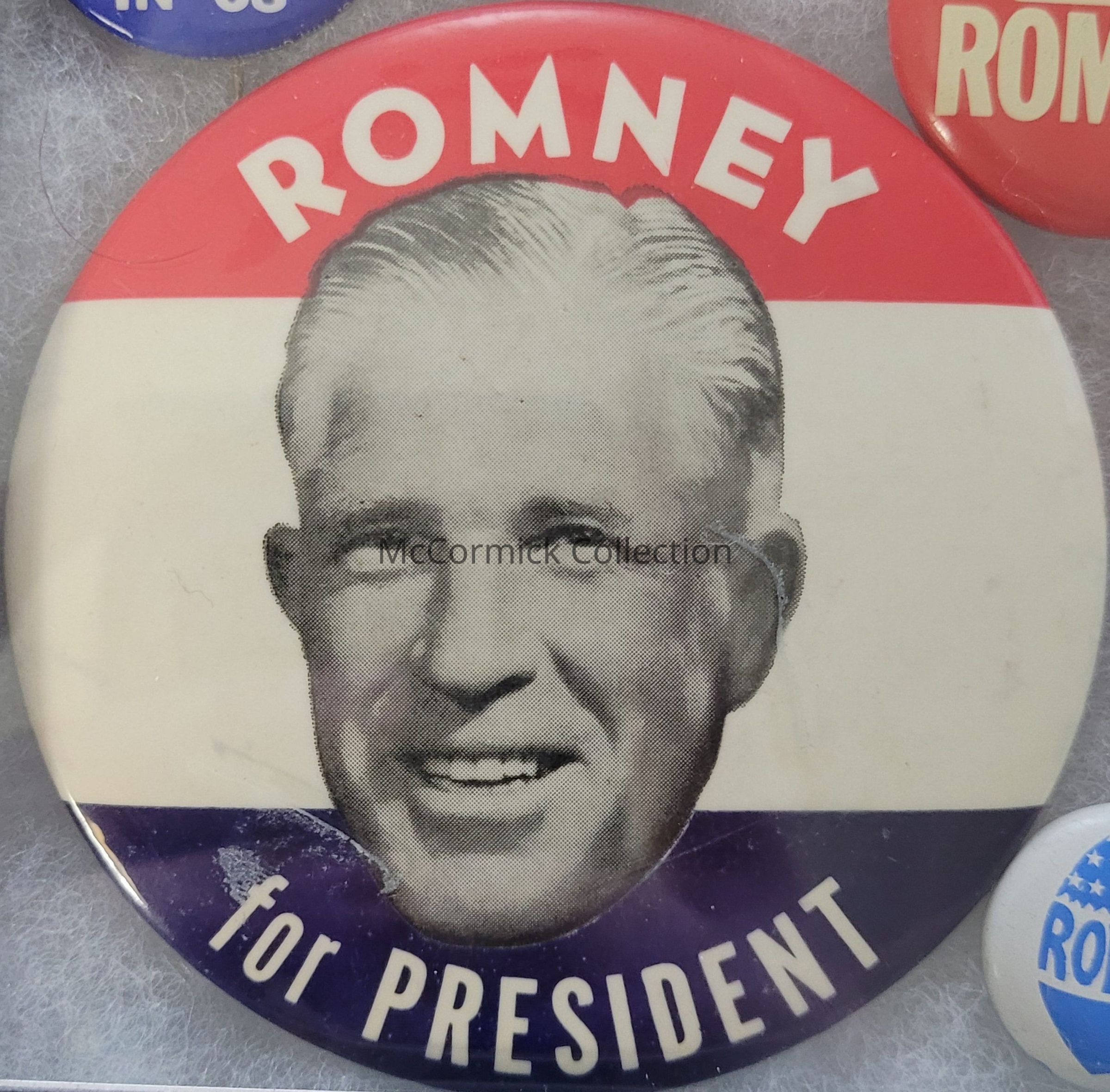 A 3.5" red, white, and blue floating head hopeful political button for George Romney for President, 1964.