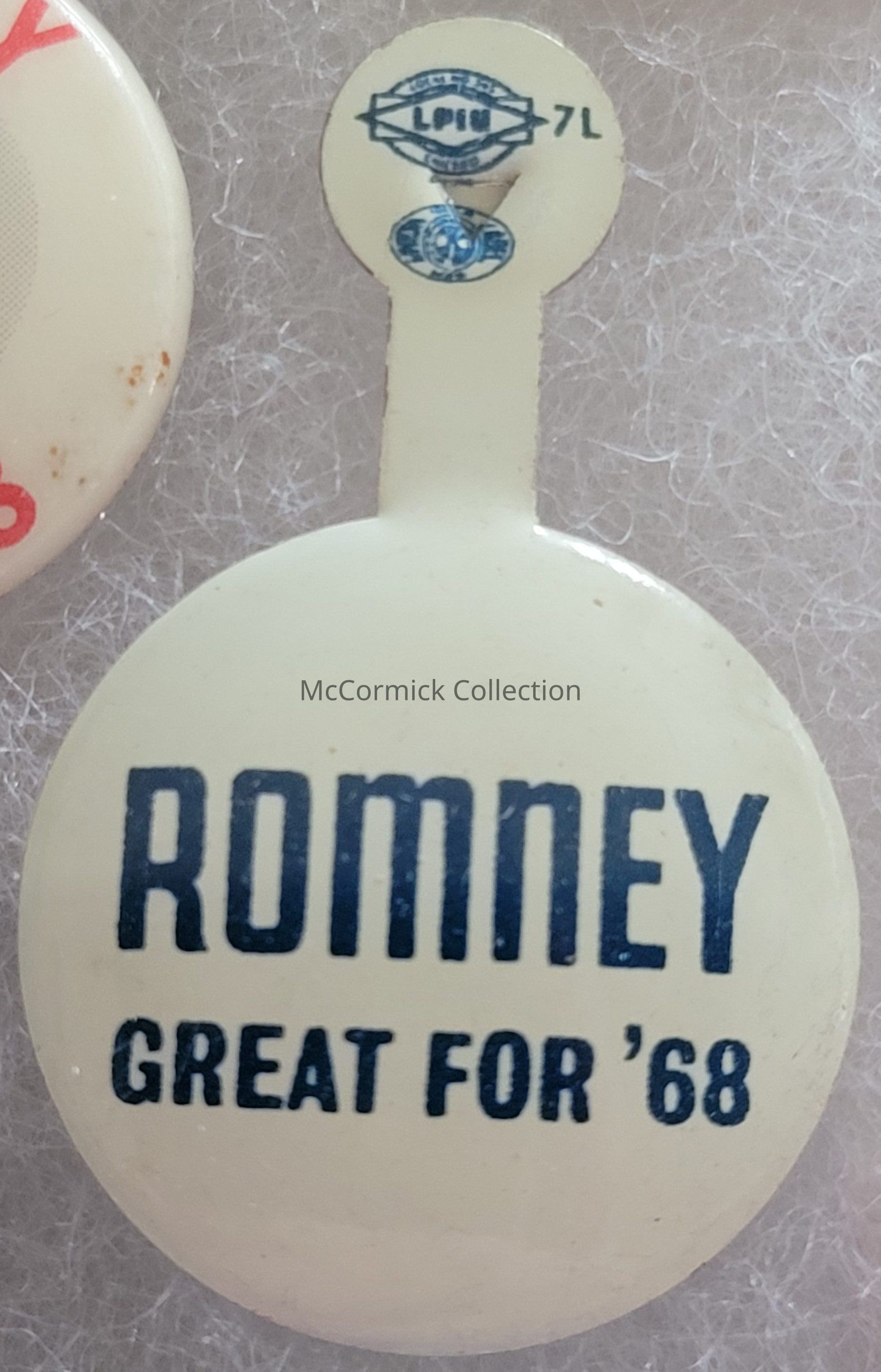 A blue and white tab for George Romney for President in 1968.