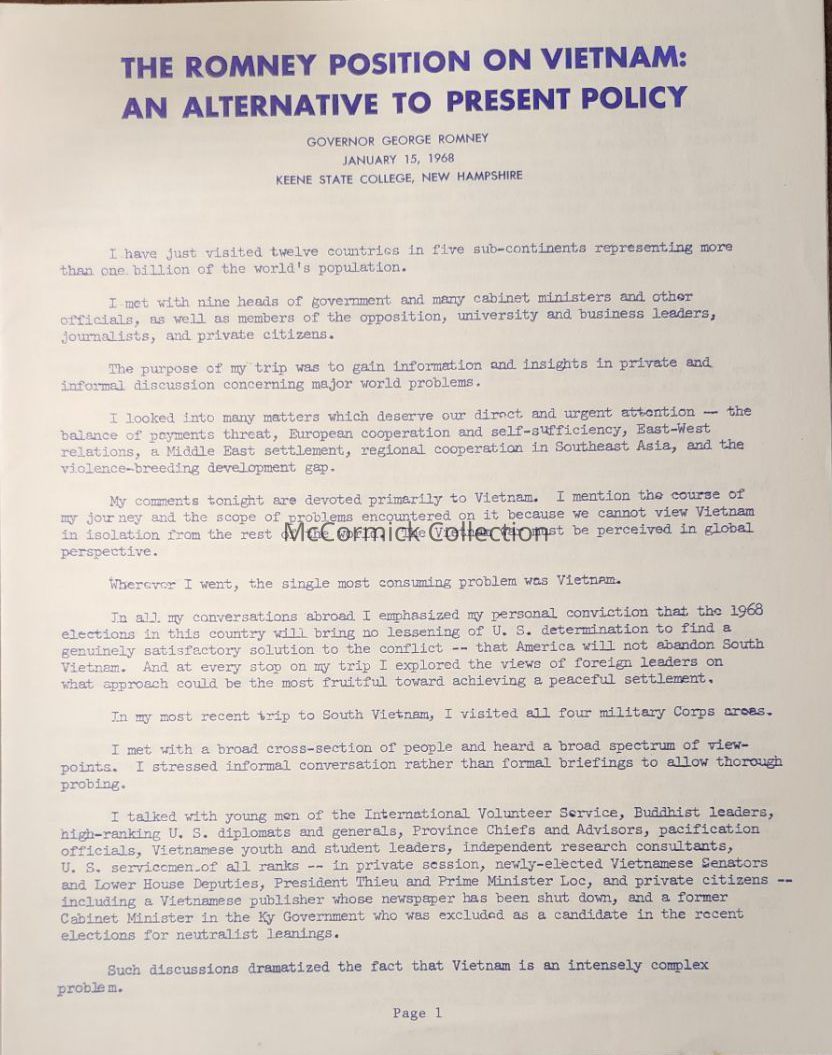 A 1968 multi-page flier on George Romney's platform on Vietnam.