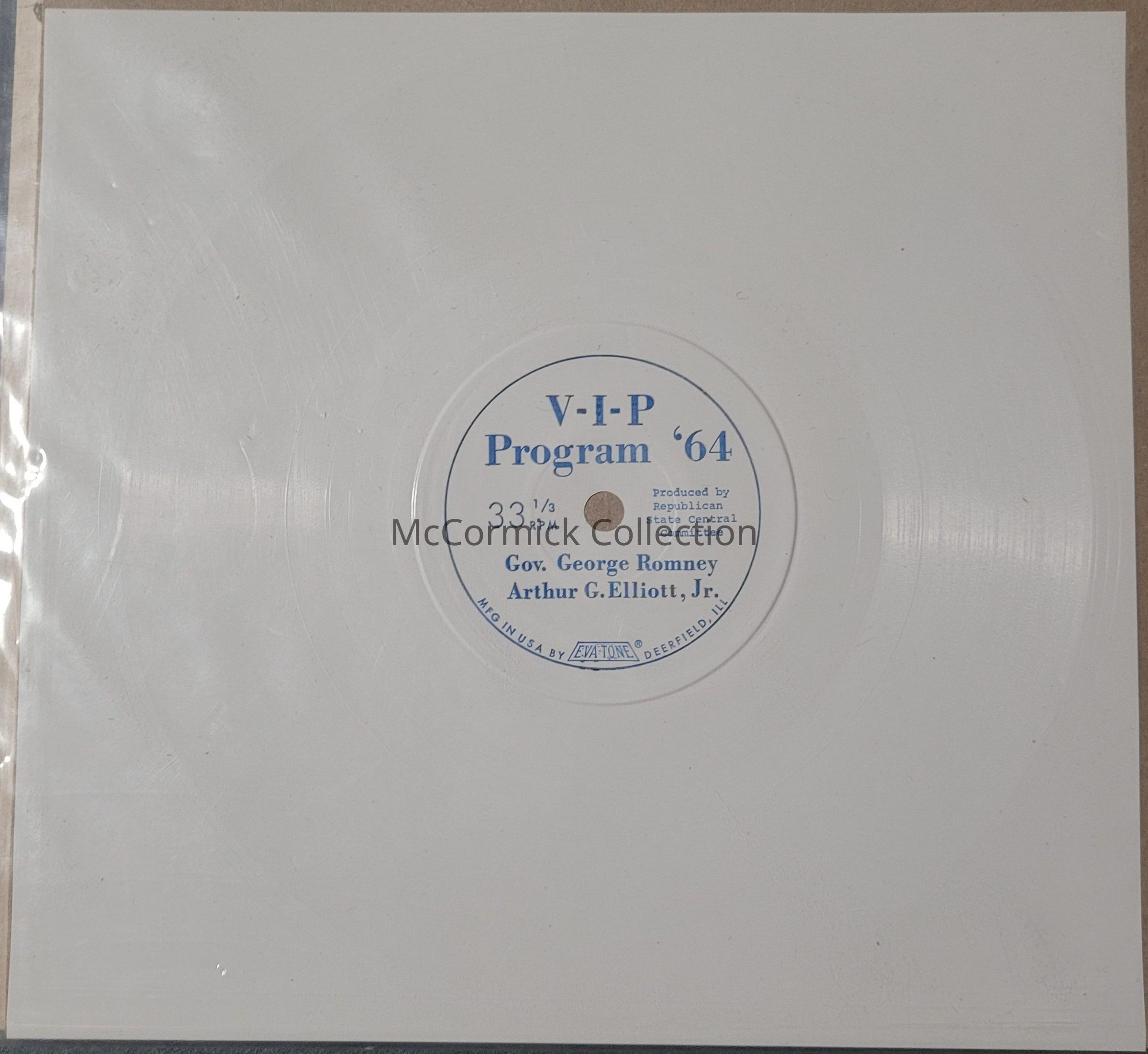 A white 33 1/3 rpm record titled "V.I.P. Program '64" of Gov. George Romney and Arthur G. Elliott, Jr., produced by Republican State Central Committee. 1964.