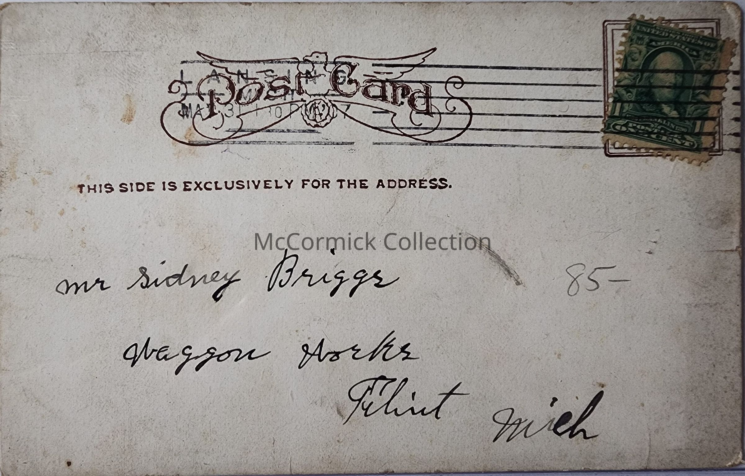 "I'll be in Lansing / May 31, 1907 / will you?" Featuring an image of Theodore Roosevelt. Teddy visited Lansing in 1907 for the Semi-Centennial of Michigan Agricultural College. Addressed to Flint, postmarked 1907. Postally used.