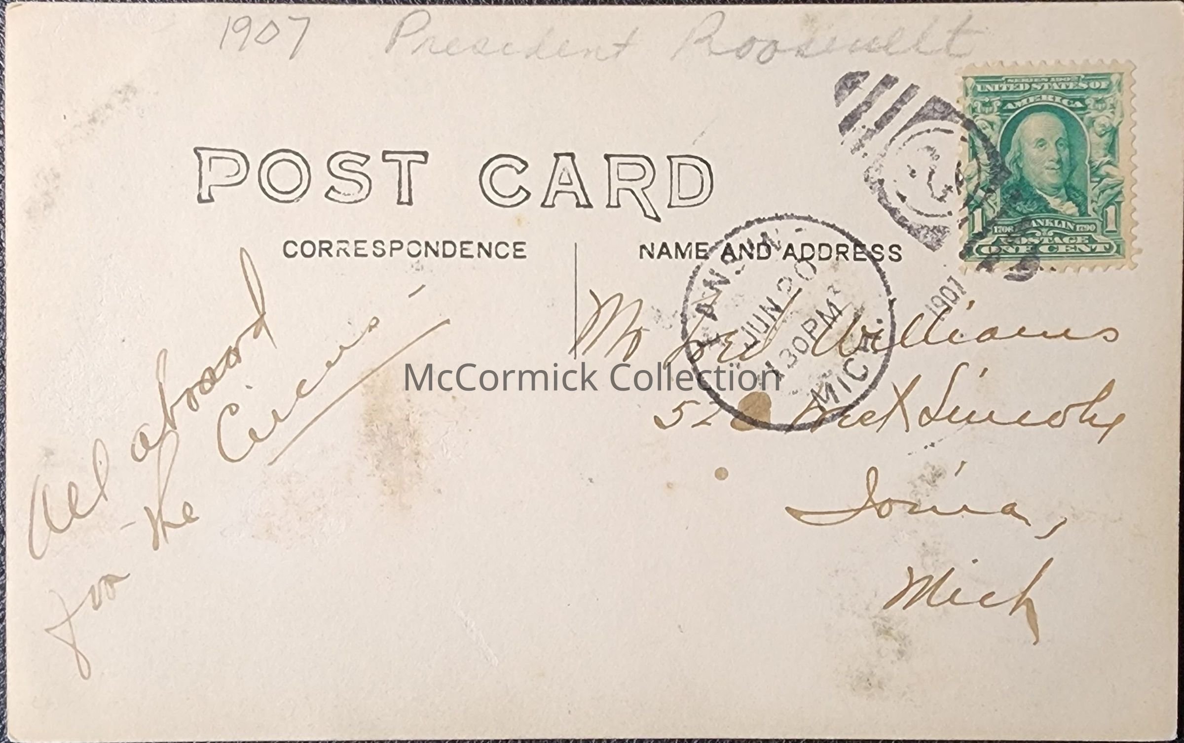 A real photo postcard of a REO automobile driven by R.E. Olds, with President Theodore Roosevelt in the backseat alongside MAC President Johnathan L. Snyder. Roosevelt was in town for the 1907 MAC Semi-Centennial, to deliver the commencement address and hand out diplomas. Postally used with Lansing postmark.