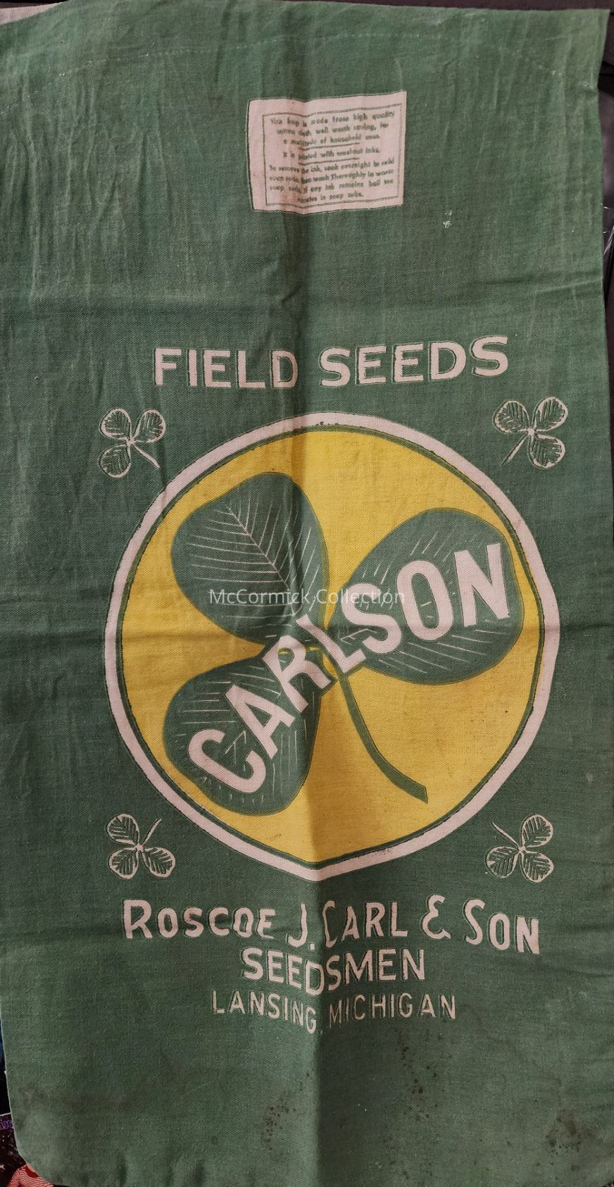 A green, yellow, and white canvas sack from Roscoe J. Carl & Son Seedsmen of Lansing, Michigan, for Field Seeds.