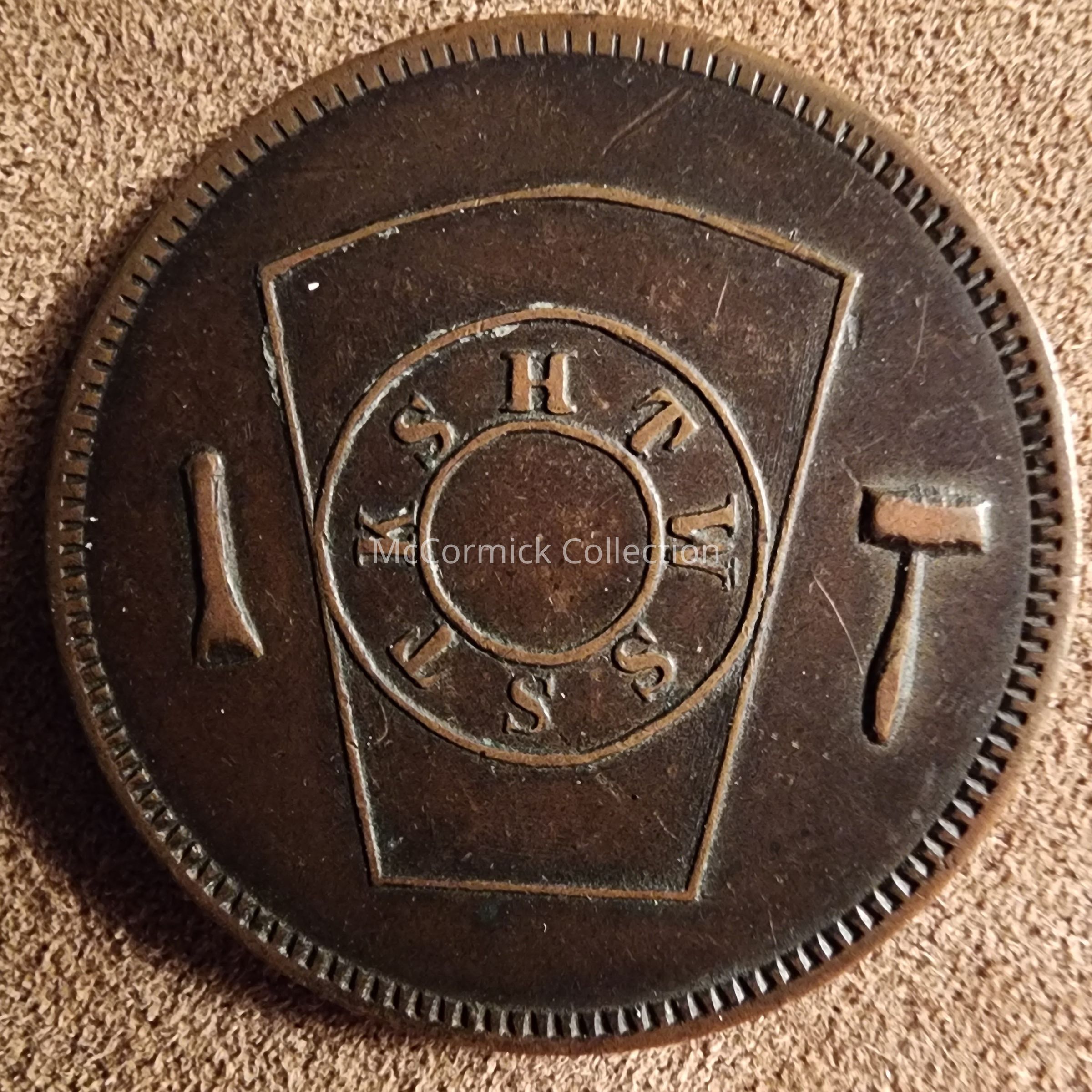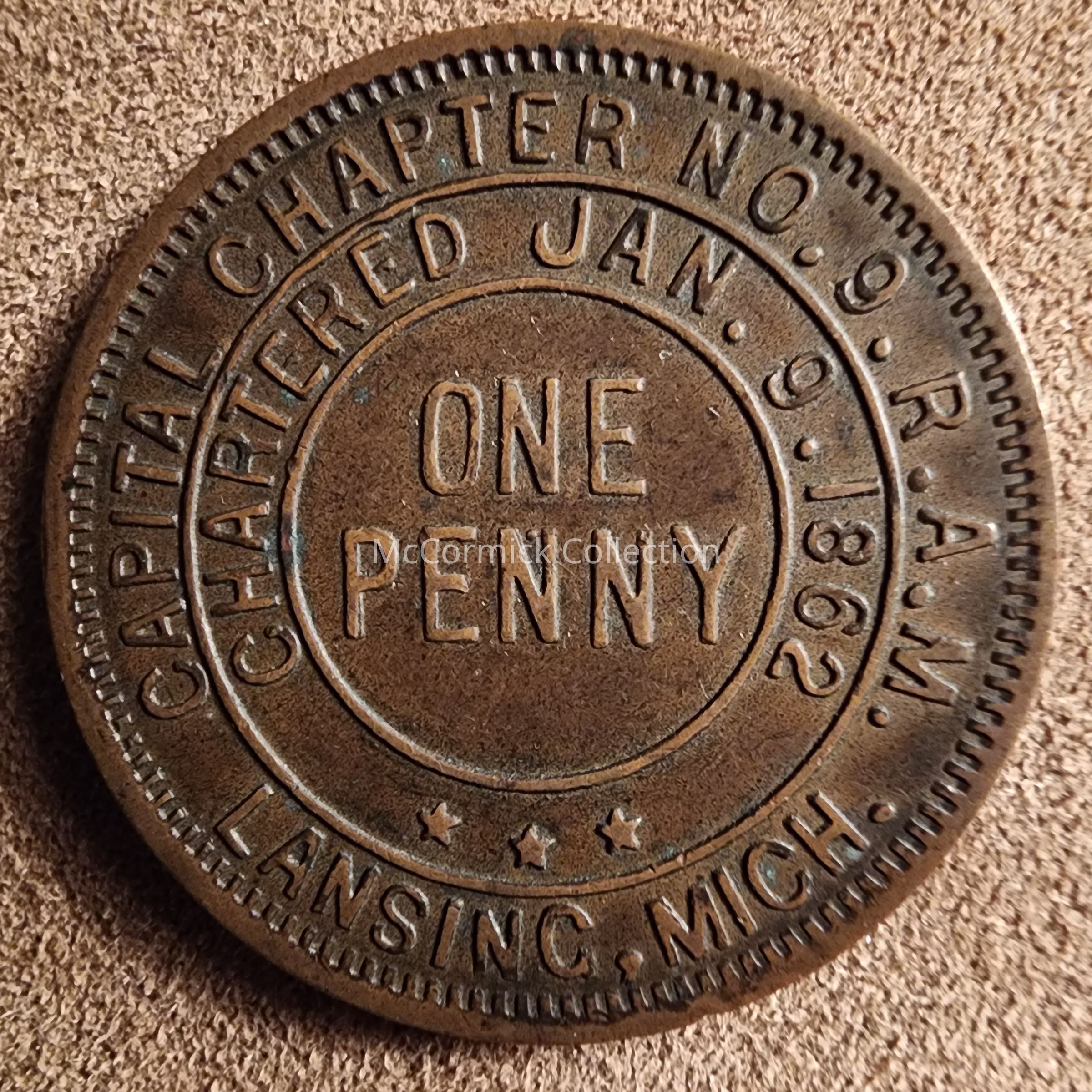 Souvenir penny from the "Capital Chapter No. 9, R.A.M., Chartered Jan. 9, 1862 / One Penny / Lansing, Mich."