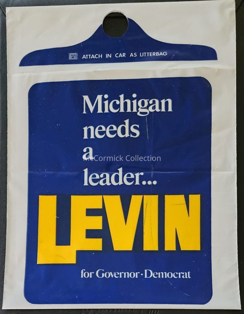 Plastic litterbag from the campaign of Sander Levin for Governor of Michigan, circa 1970 or 1974.