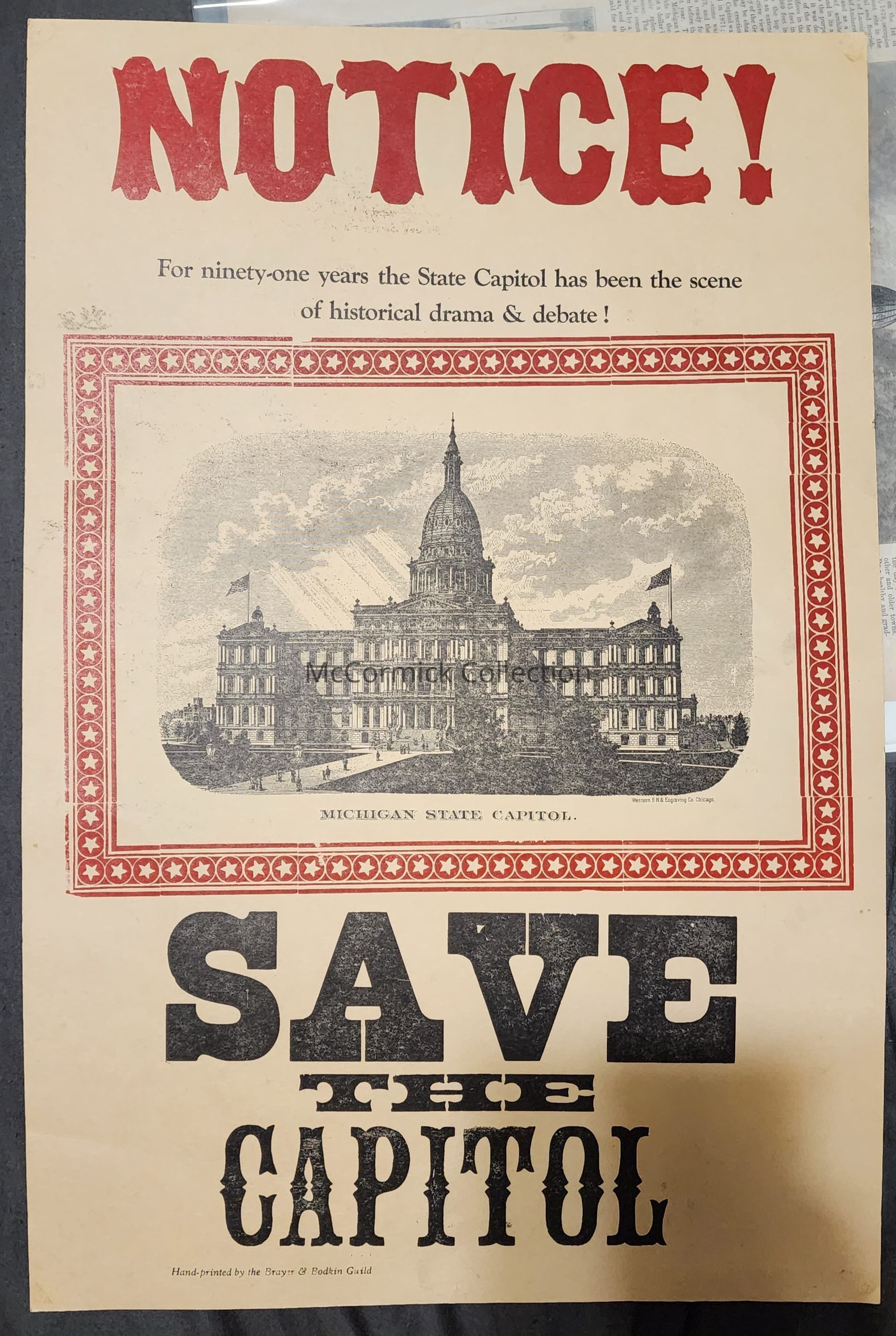 Broadside printed circa 1970 by the Brayer and Bodkin Guild using typeface from the MSU Museum. The Save the Capitol theme refers to the effort to demolish and replace the 1879 State Capitol.