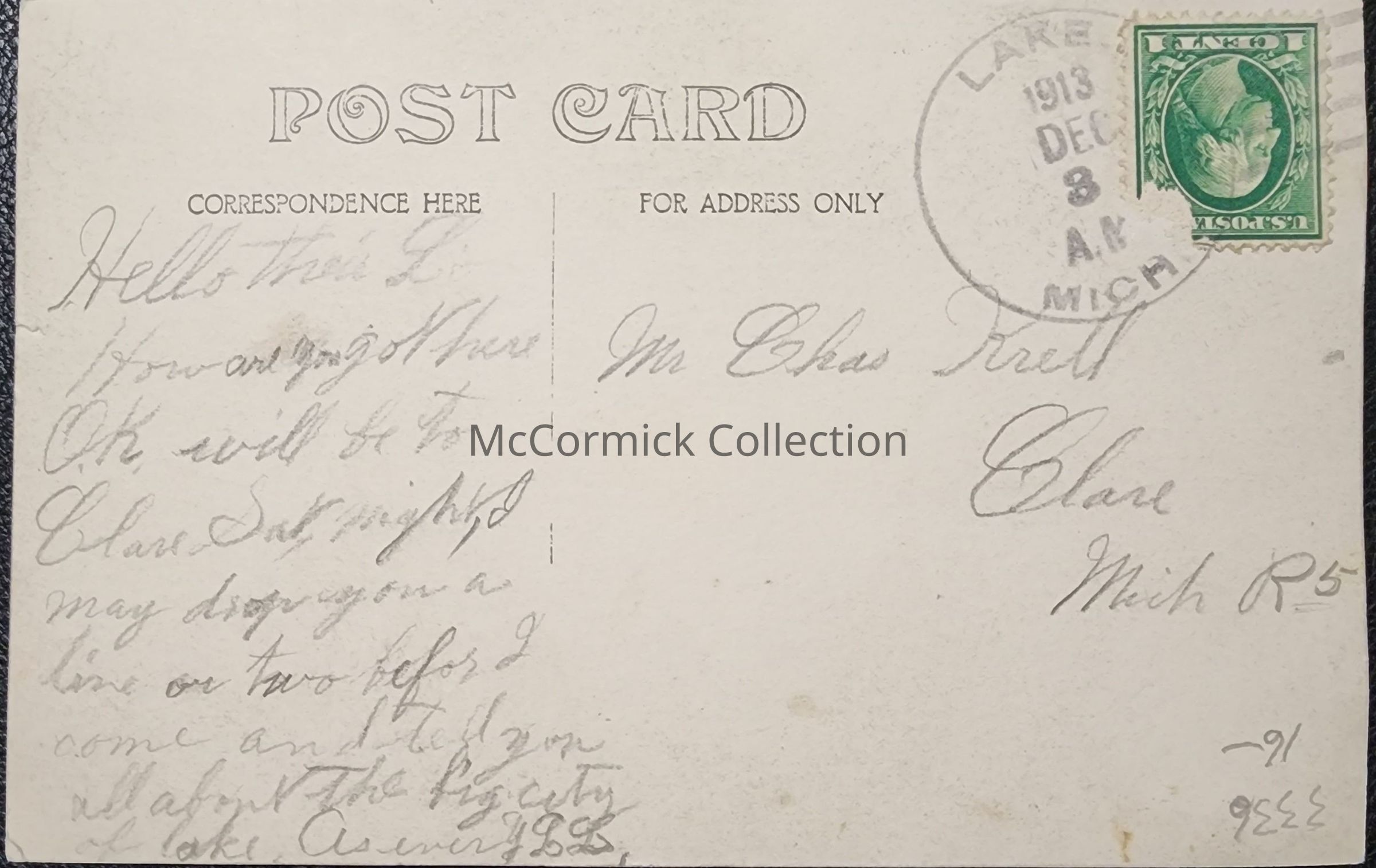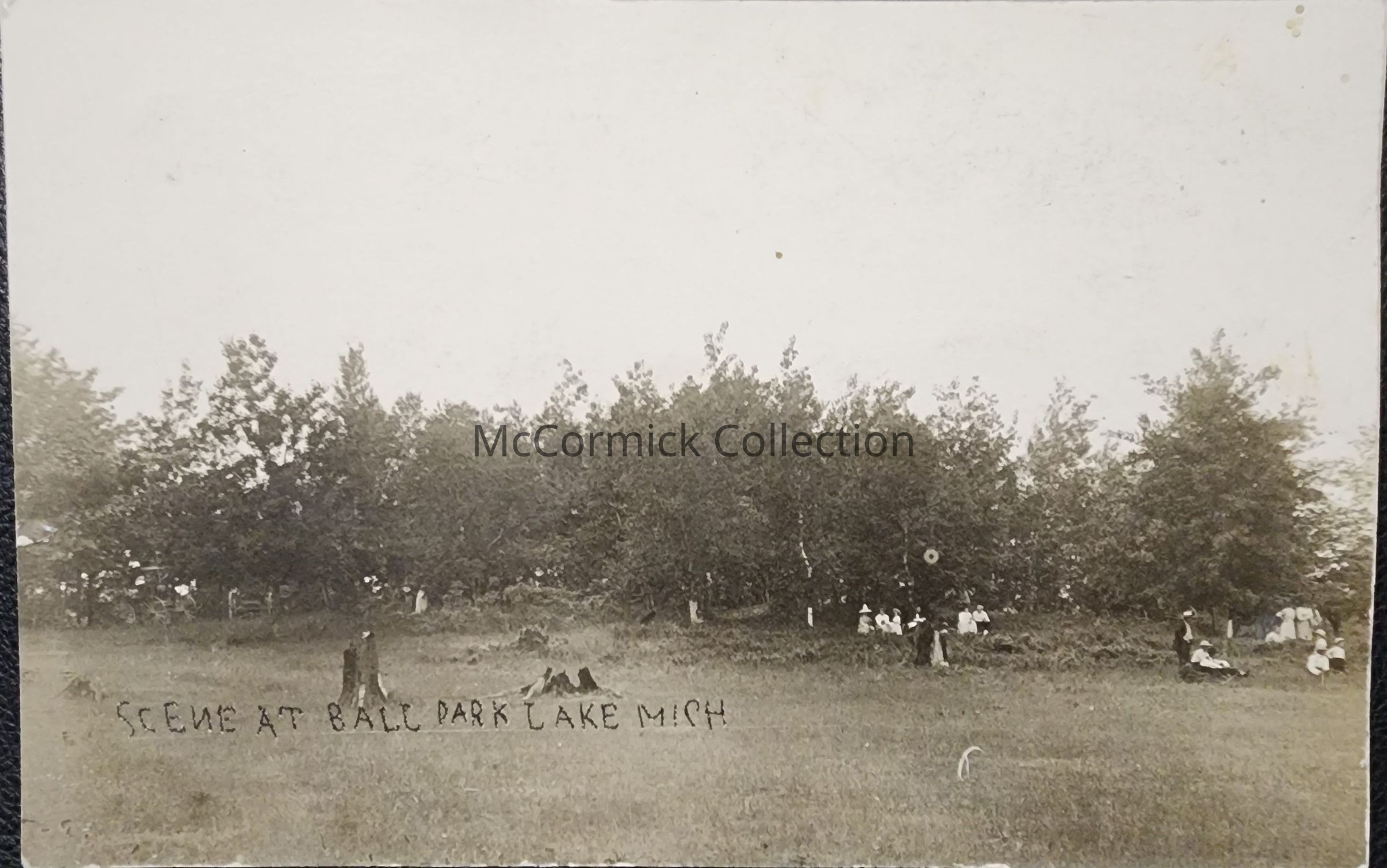 Real photo postcard of a ball park scene at Lake, Michigan. Postally used, 1913 Lake postmark. Addressed to Clare.