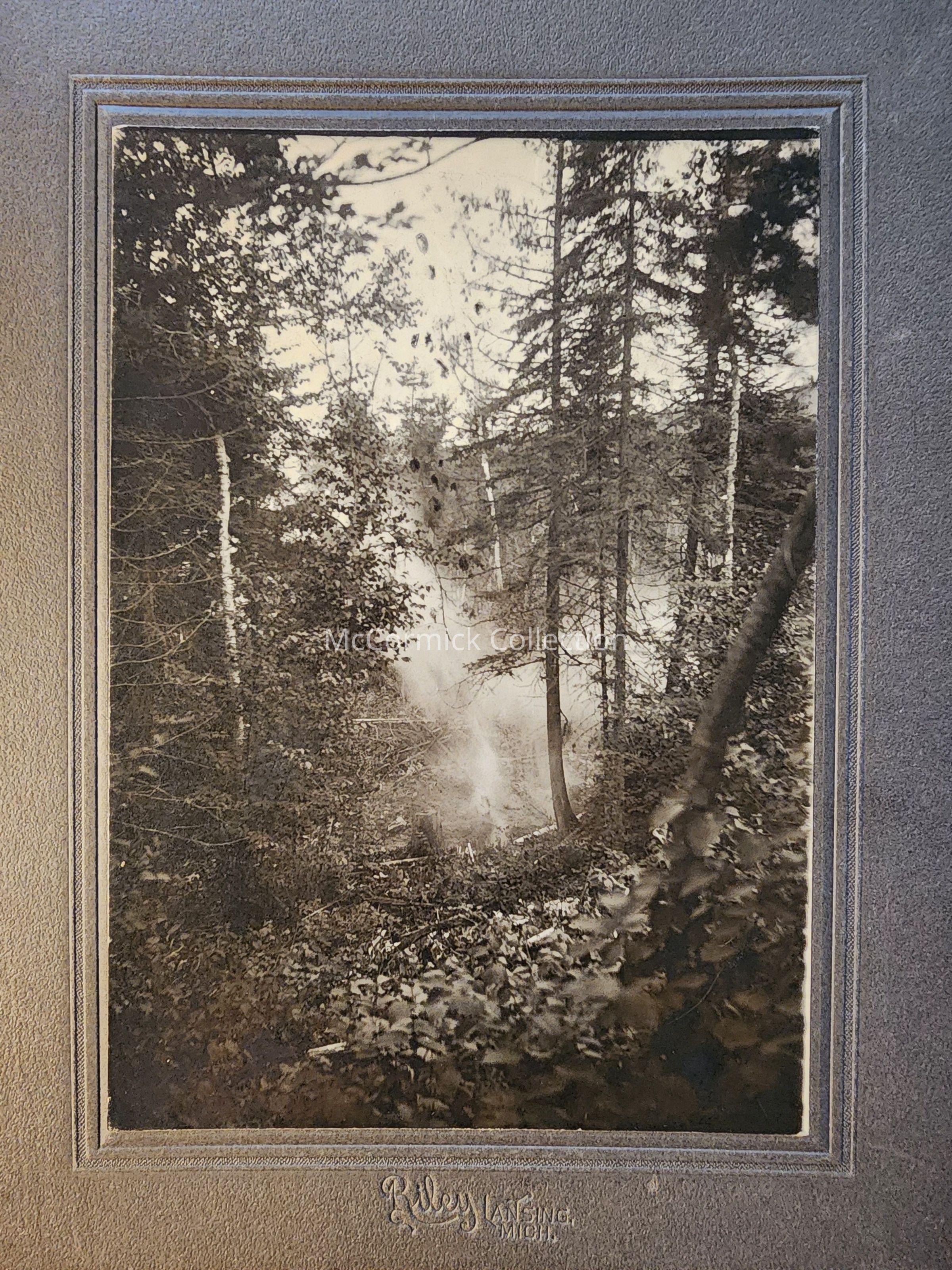 Card mounted scenic view of a wooded hill, possibly showing the esker, by Lansing photographer Riley. From the Chase Collection.