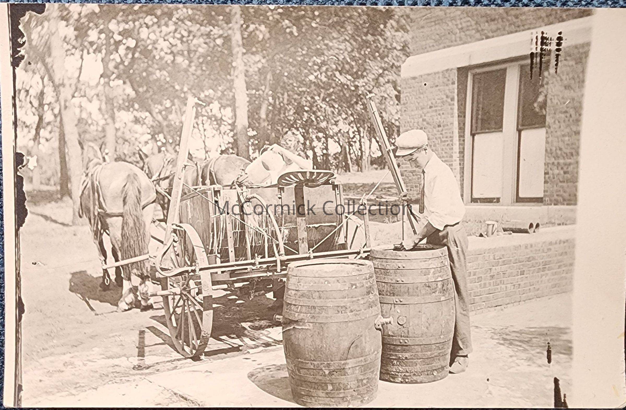 One of a set of real photo postcards believed to be from Lansing, Michigan, of the Michigan Agricultural College, Boys Industrial School, or Michigan School for the Blind. This view shows a student with a wagon, horses, and barrels.