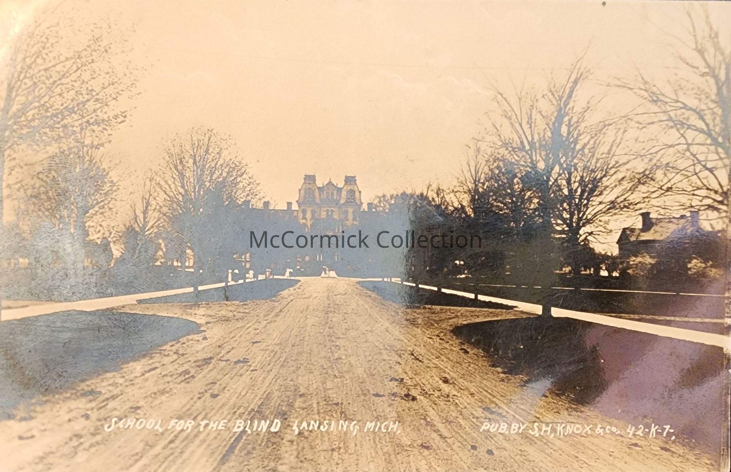 Real photo postcard of the Michigan School for the Blind in Lansing, Michigan. Published by S.H. Knox & Co. Heavily mirrored finish.