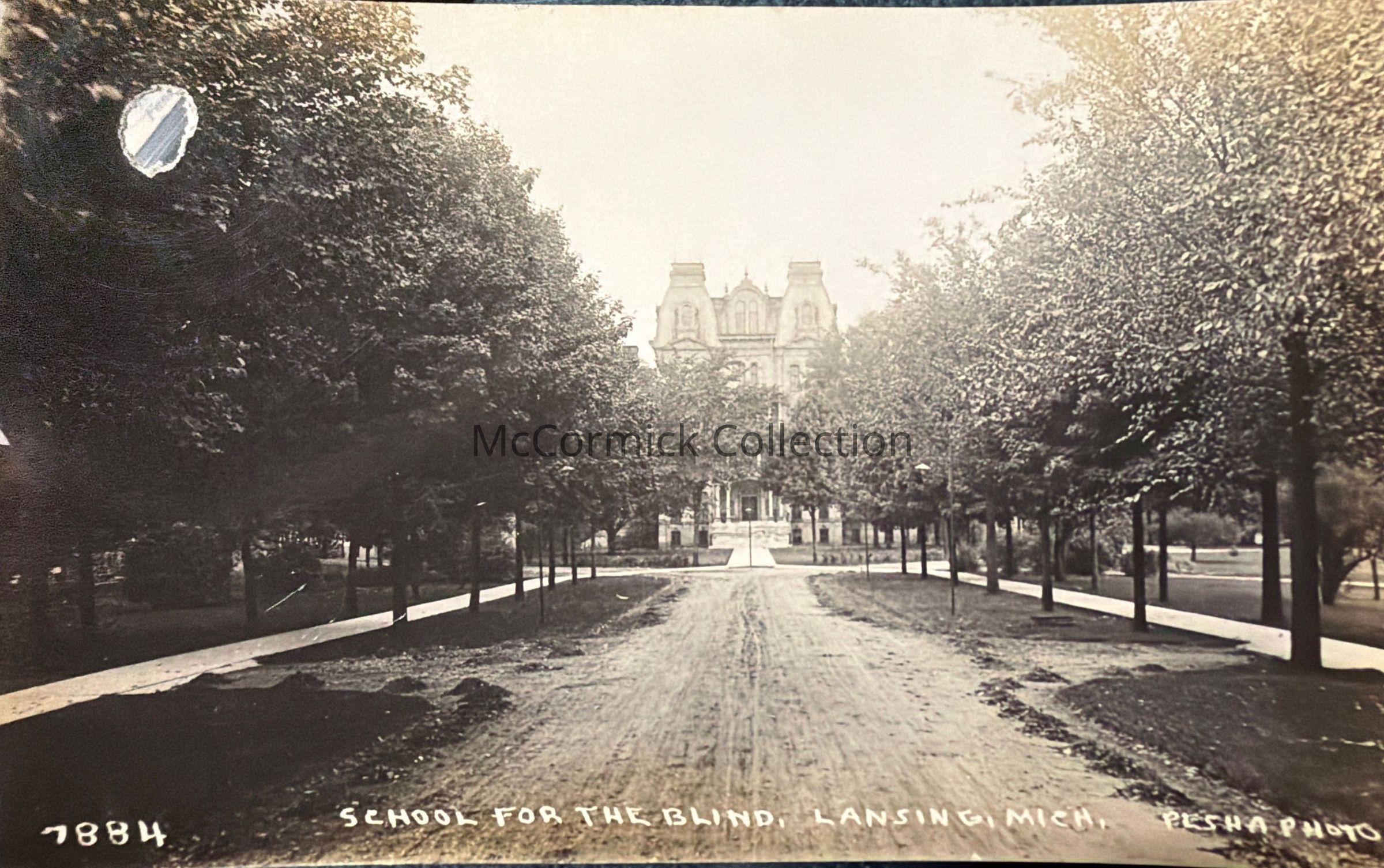 Real photo postcard of the Michigan School for the Blind in Lansing by photographer Pesha. Postally unused. Removed from Pesha salesman sample, hole from brad.