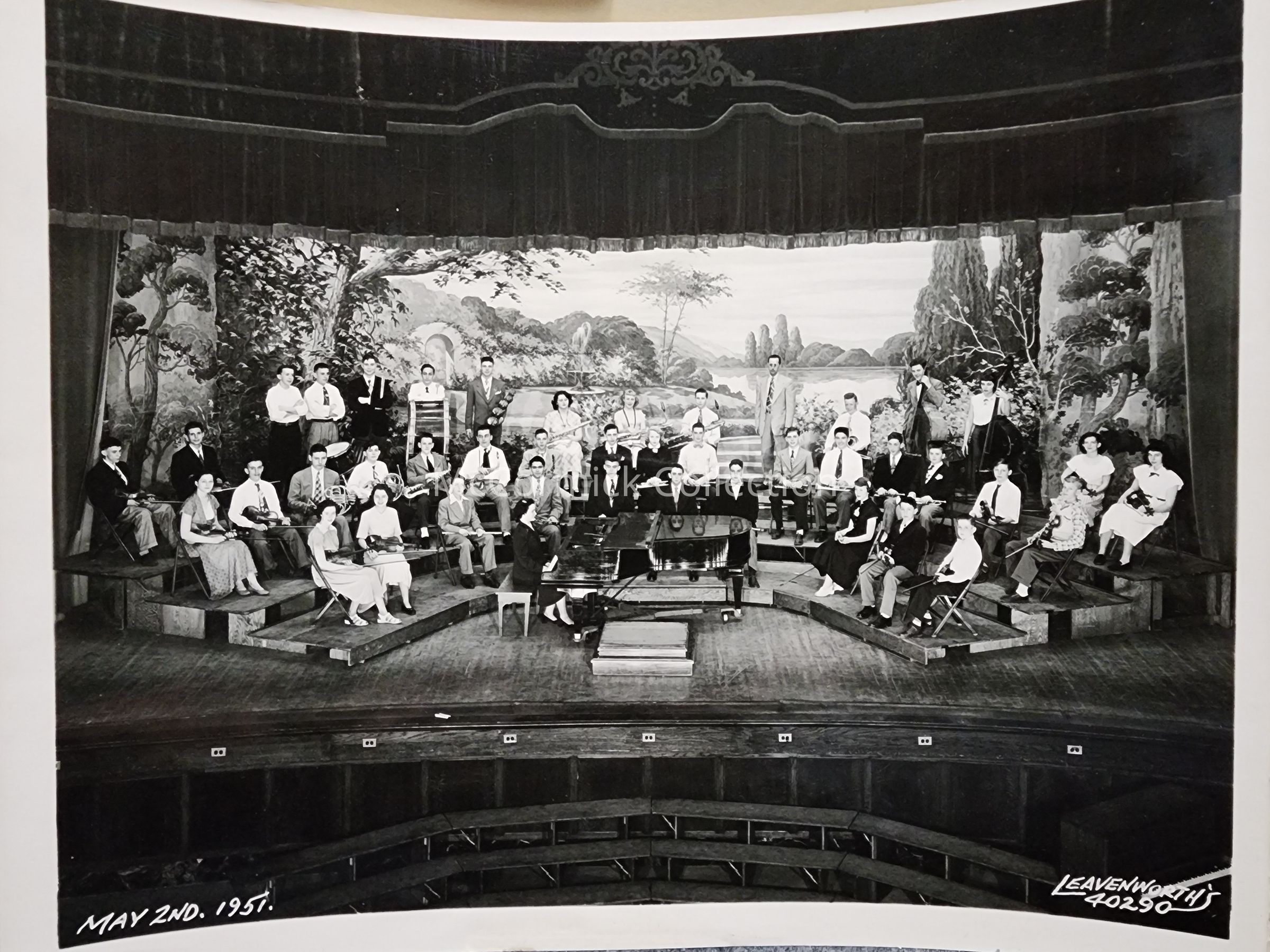 Photographic print of an unidentified school band or orchestra on a stage by Lansing photographer Leavenworth. Dated May 2, 1951.