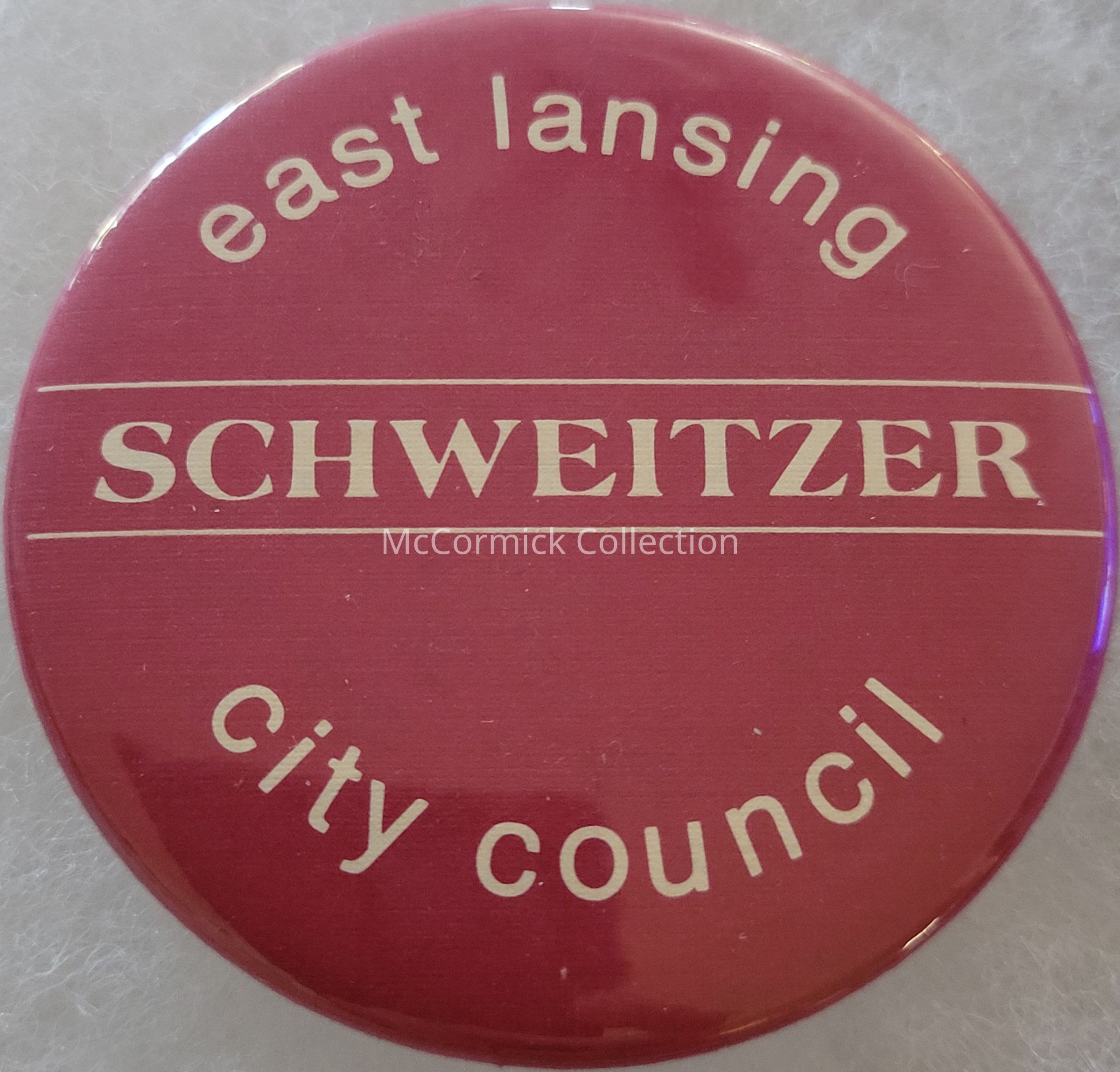 Maroon and white political button, 2.25", for Schweitzer for East Lansing City Council. Kingdon Collection.