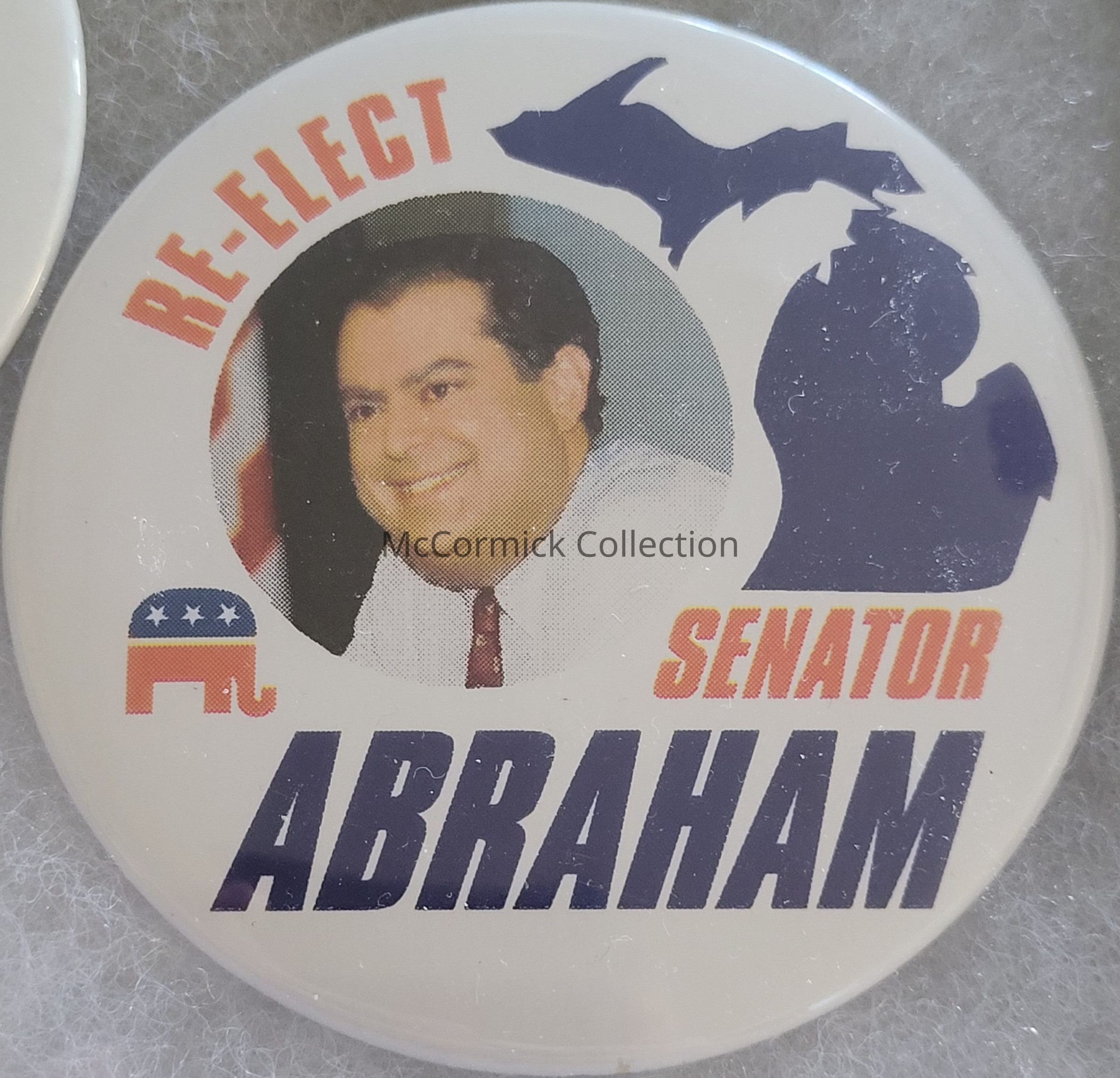 A 3" color and red, white, and blue political picture button for Spencer Abraham for reelection to the United States Senate in 2000. Served one term, 1995-2001.