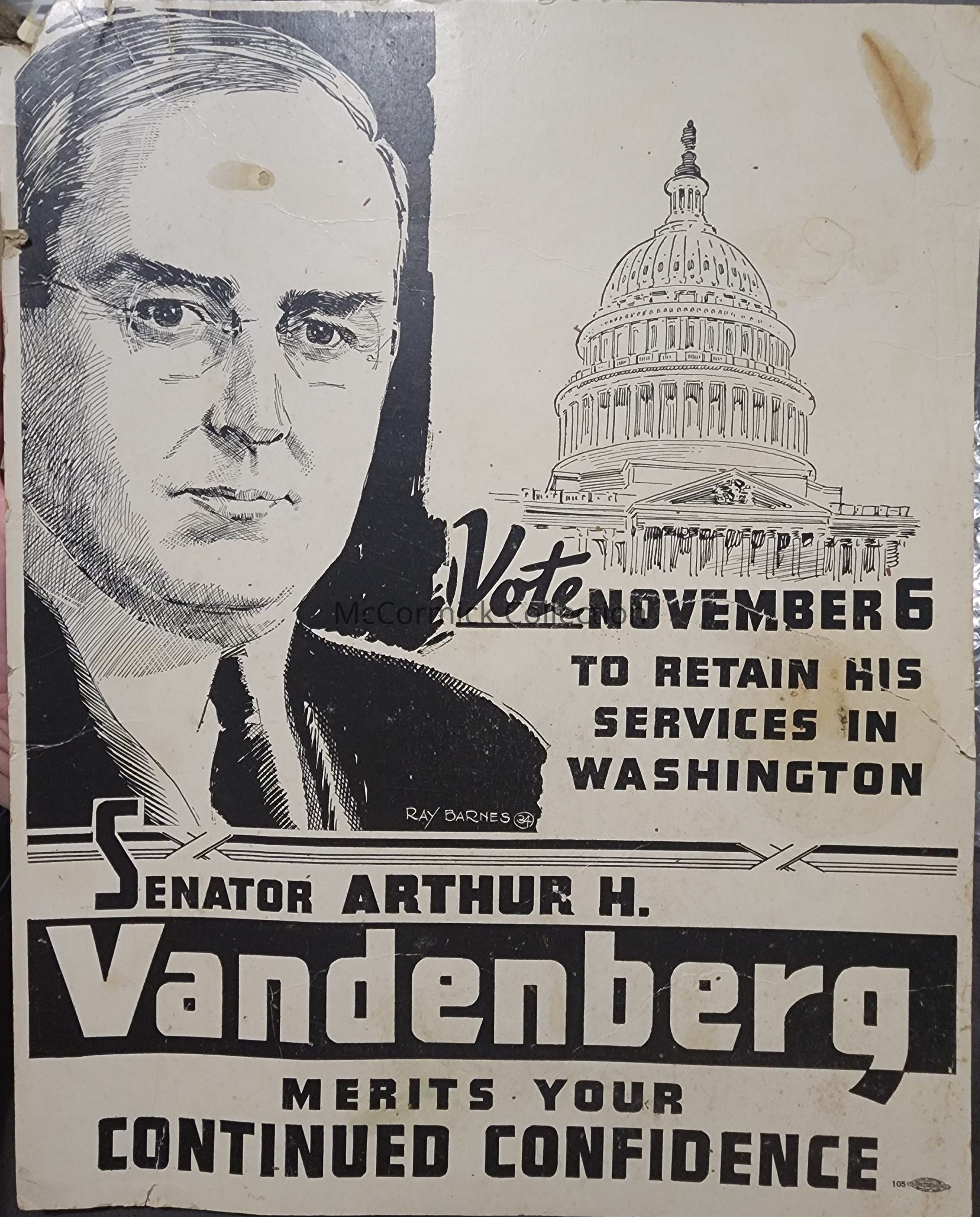 A 1930s political campaign poster for Michigan U.S. Senator Arthur H. Vandenberg. Slogan is "... merits your continued confidence;" and "Vote November 6 to Retain his Services in Washington." Image by Ray Barnes 34. Image of Vandenberg and the U.S. Capitol.