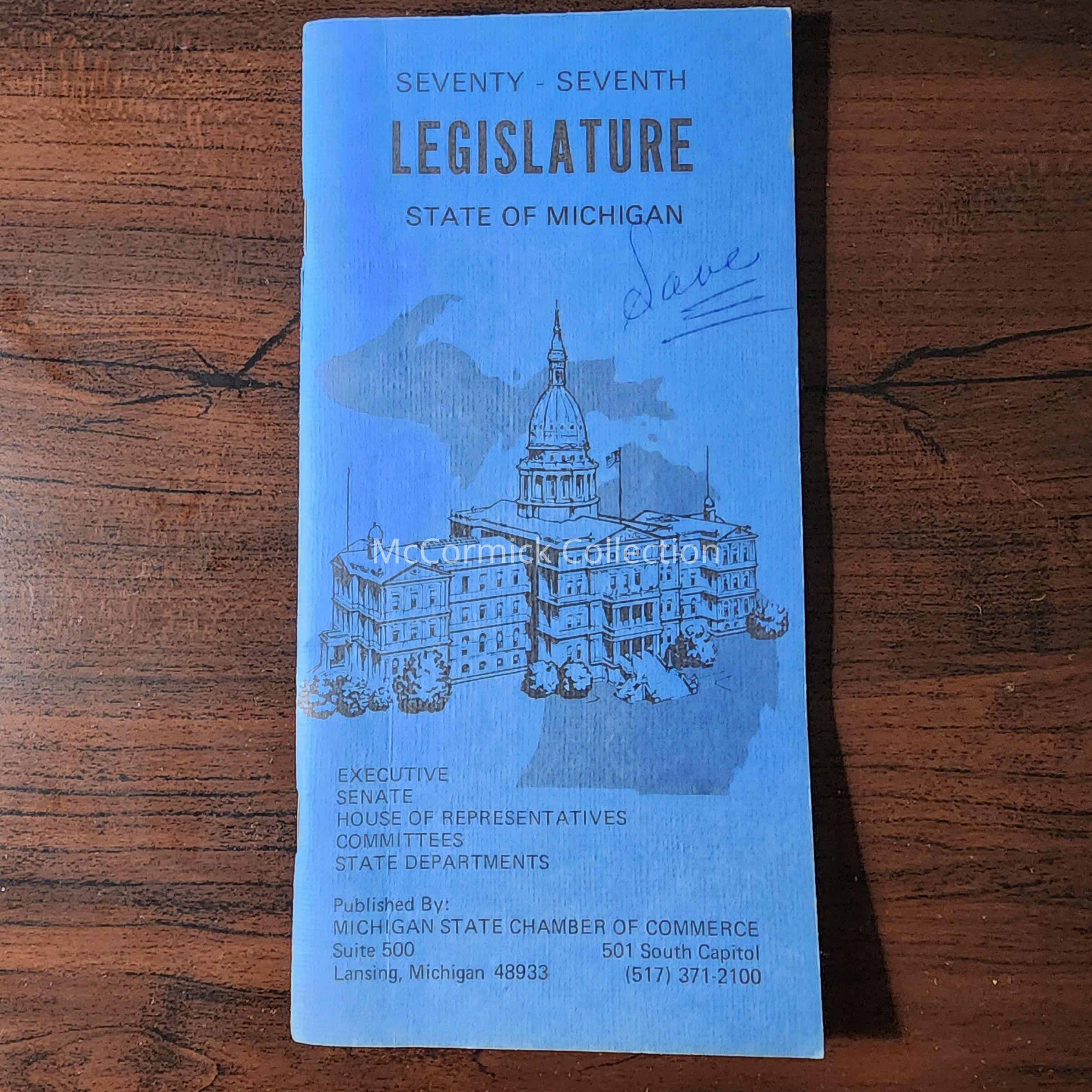 Handbook or directory of the Seventy-Seventh Legislature of Michigan, circa 1970s.