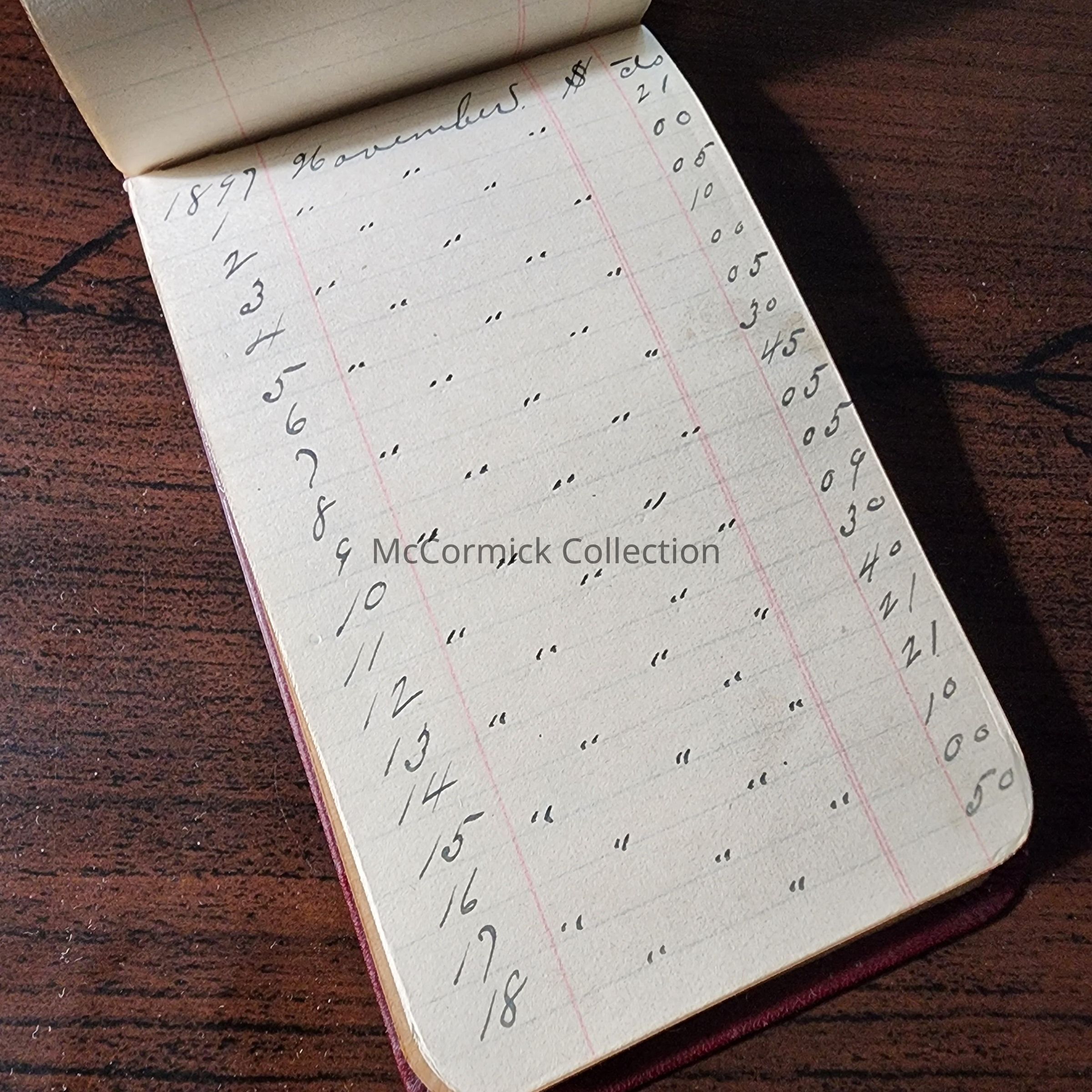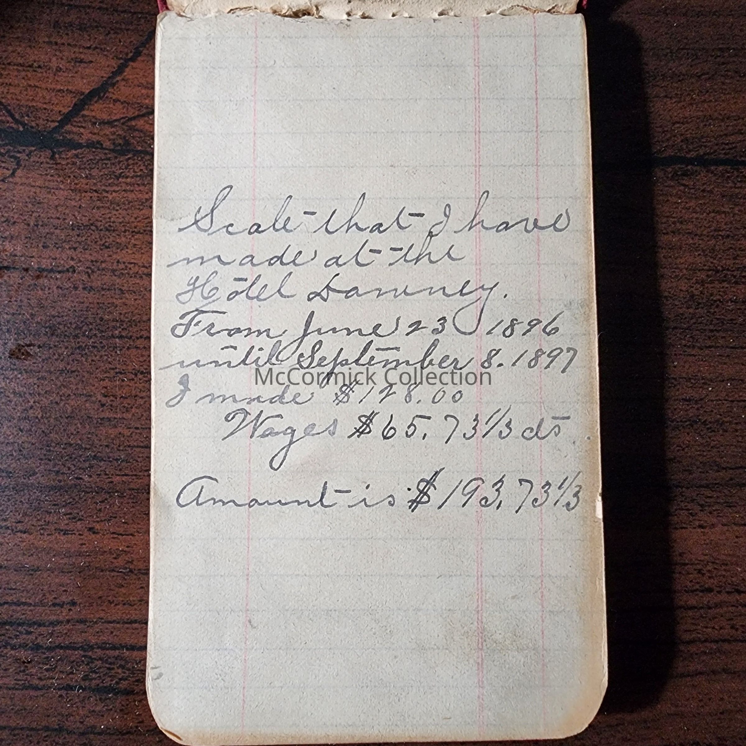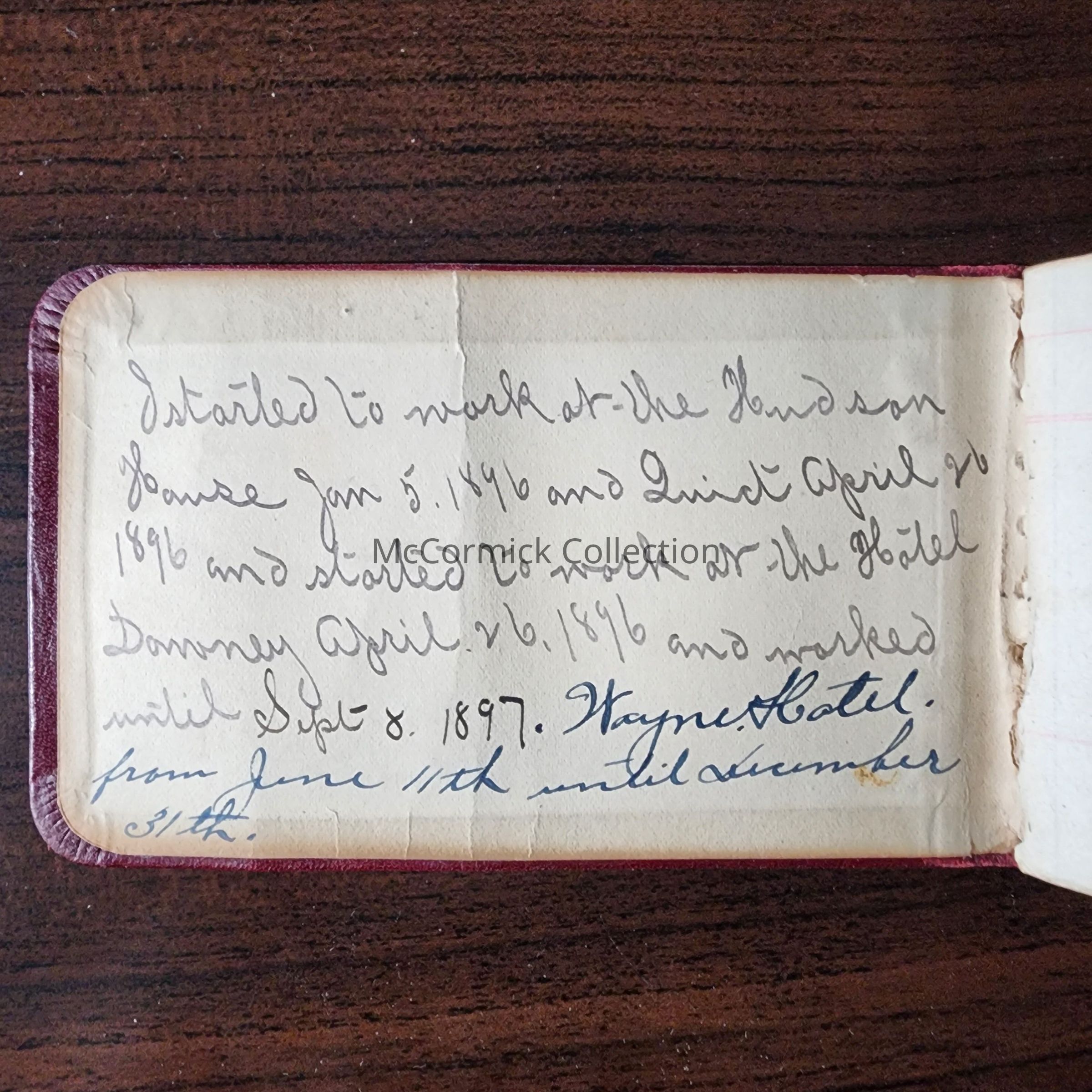 Small red leather bound notebook, possibly belonging to Henry Siebert, which mentions the Hudson House, Hotel Downey, and Wayne Hotel. Circa 1890s. From Siebert Estate.