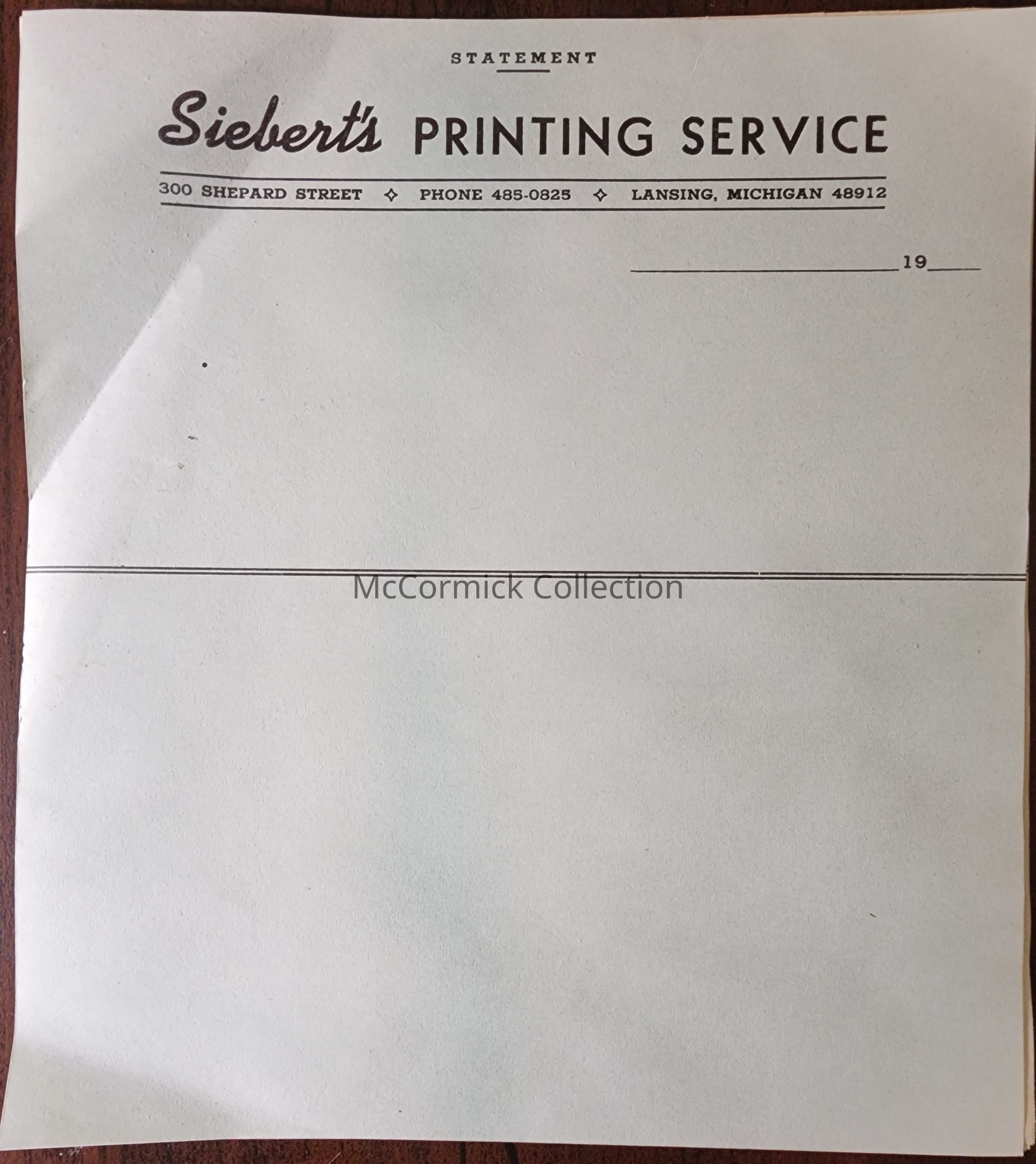 Set of green blank statement stationery from Siebert's Printing Service of Lansing, Michigan. From Siebert Estate.