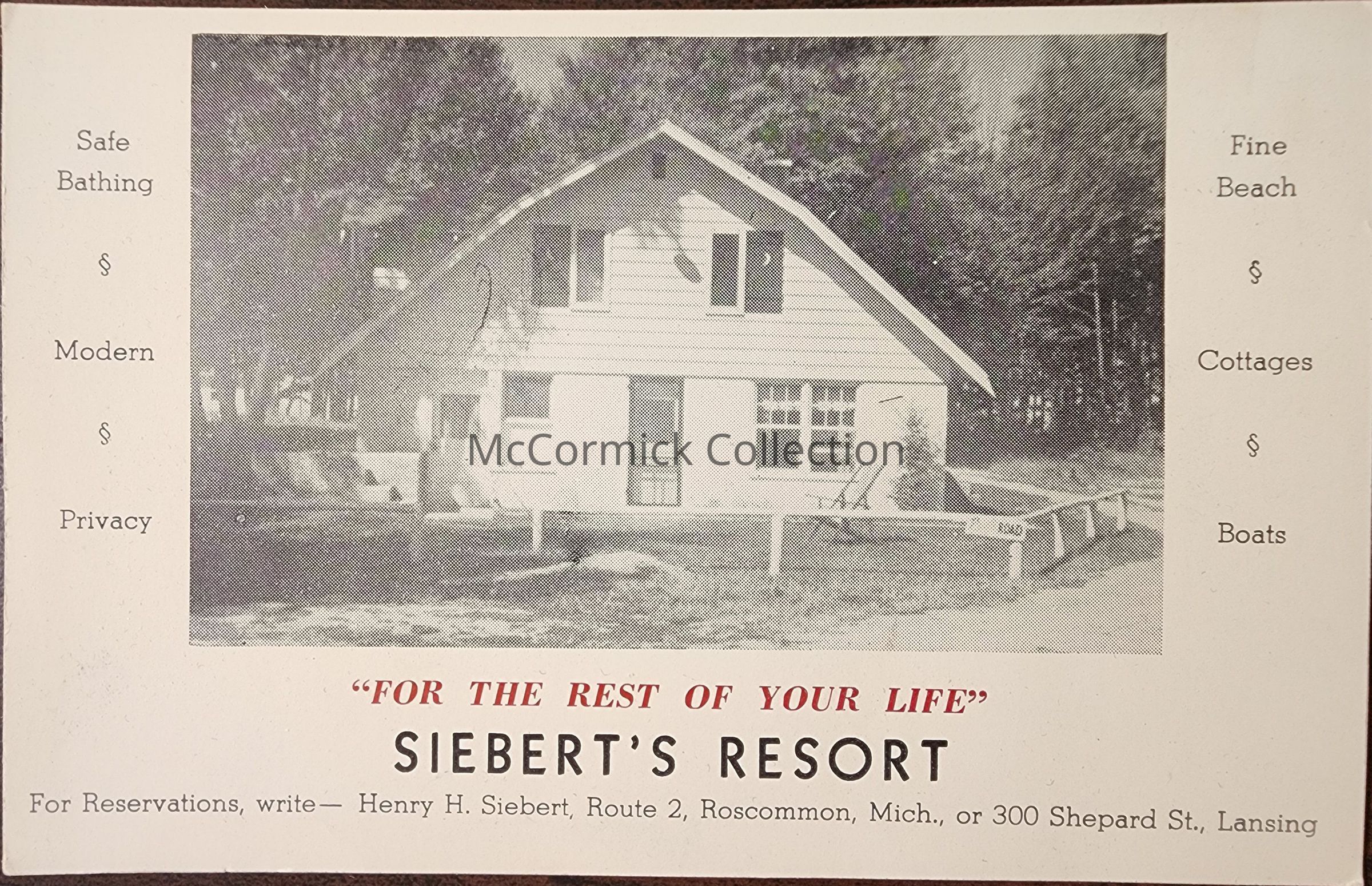 Advertising Postcard for Siebert's Resort in Roscommon, Michigan, at Houghton Lake, owned and built by Henry H. Siebert of Lansing, Michigan. From Siebert Estate.