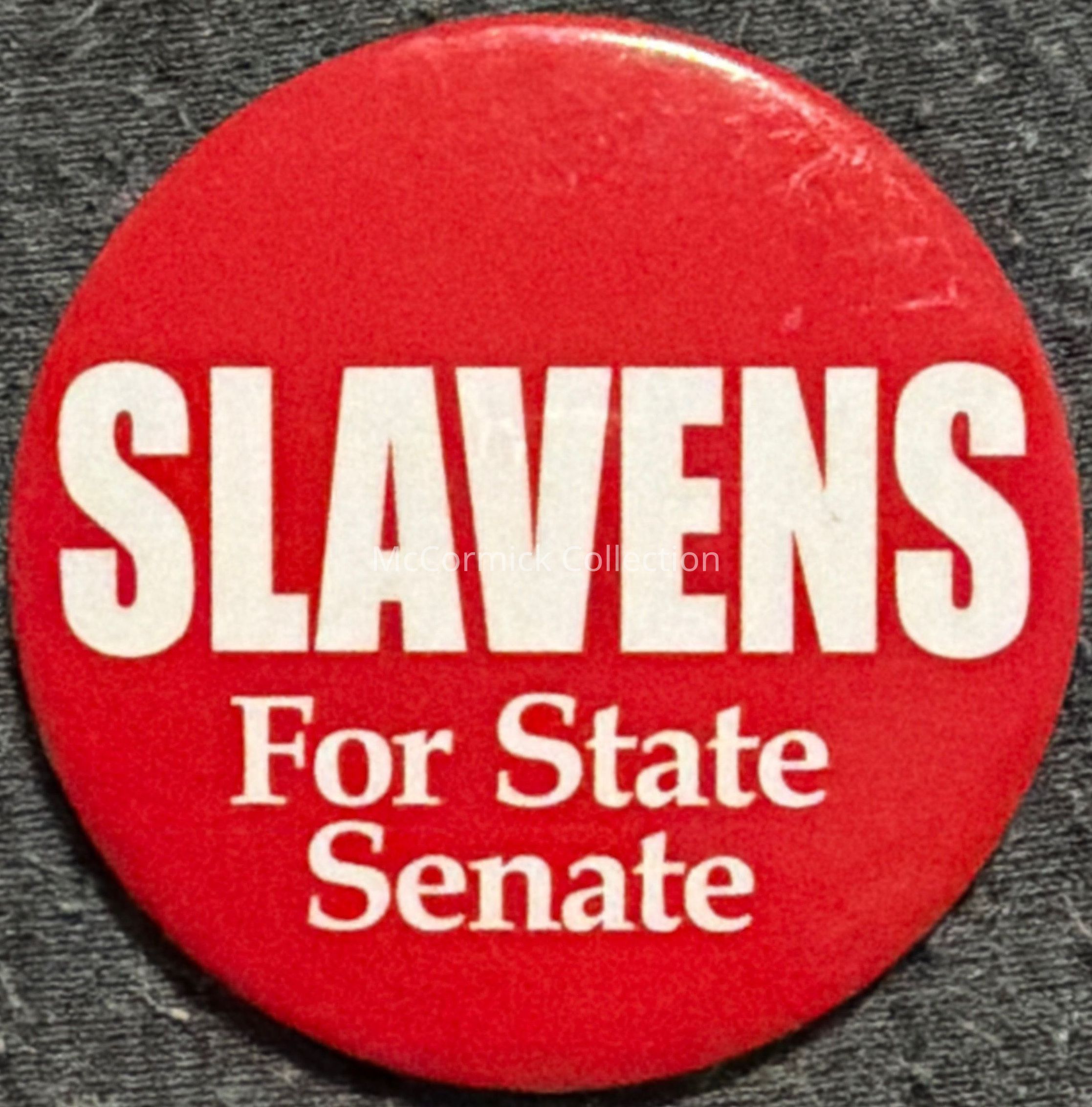 A 2.25” red and white political button for Mark Slavens for Michigan State Senate, 2006. Unsuccessful.