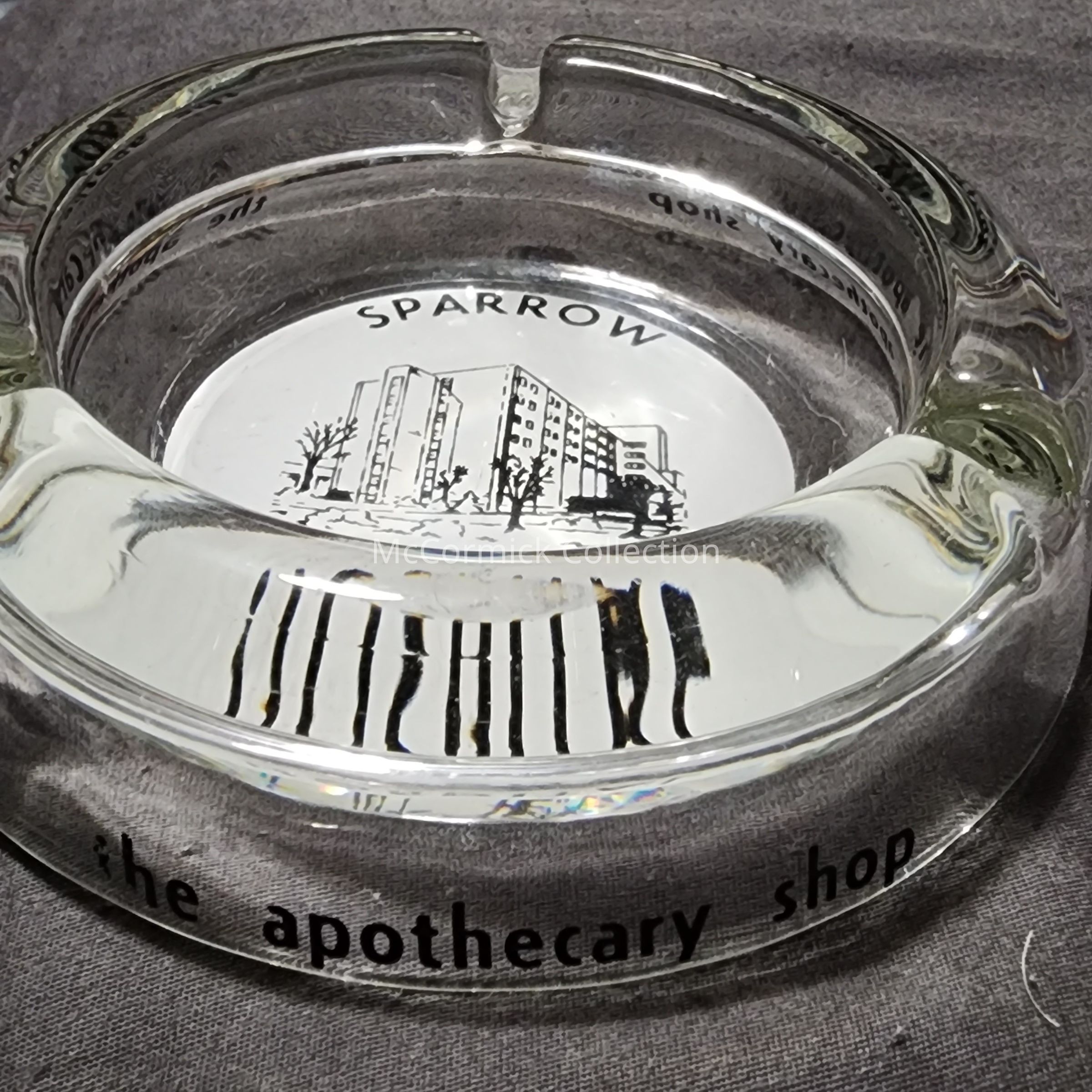 A glass advertising ashtray for Sparrow Hospital in Lansing, Michigan, with Apothecary Shop advertising