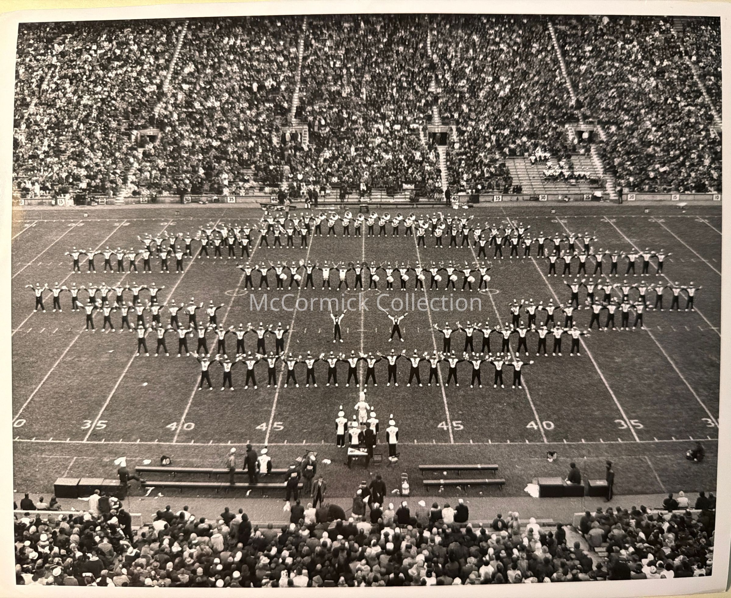 Photographic print of the Michigan State University Spartan Marching Band, 1966, in formation on the field.