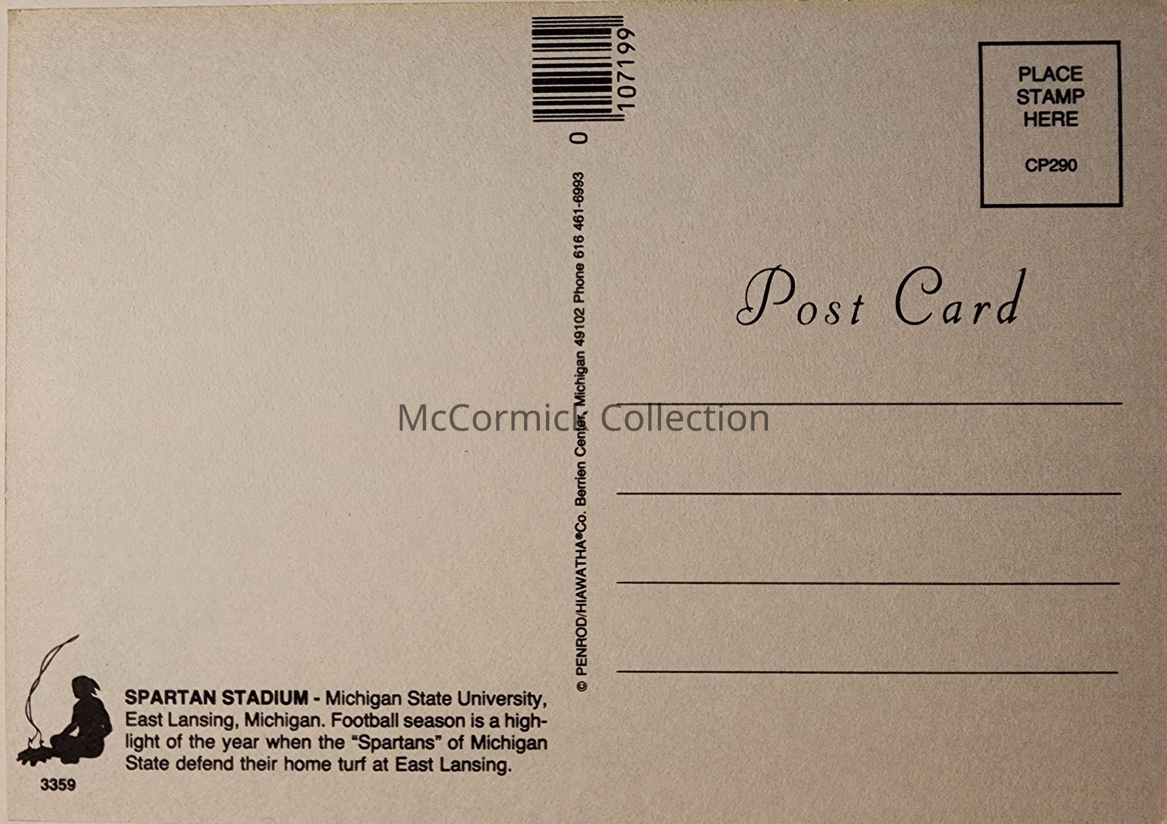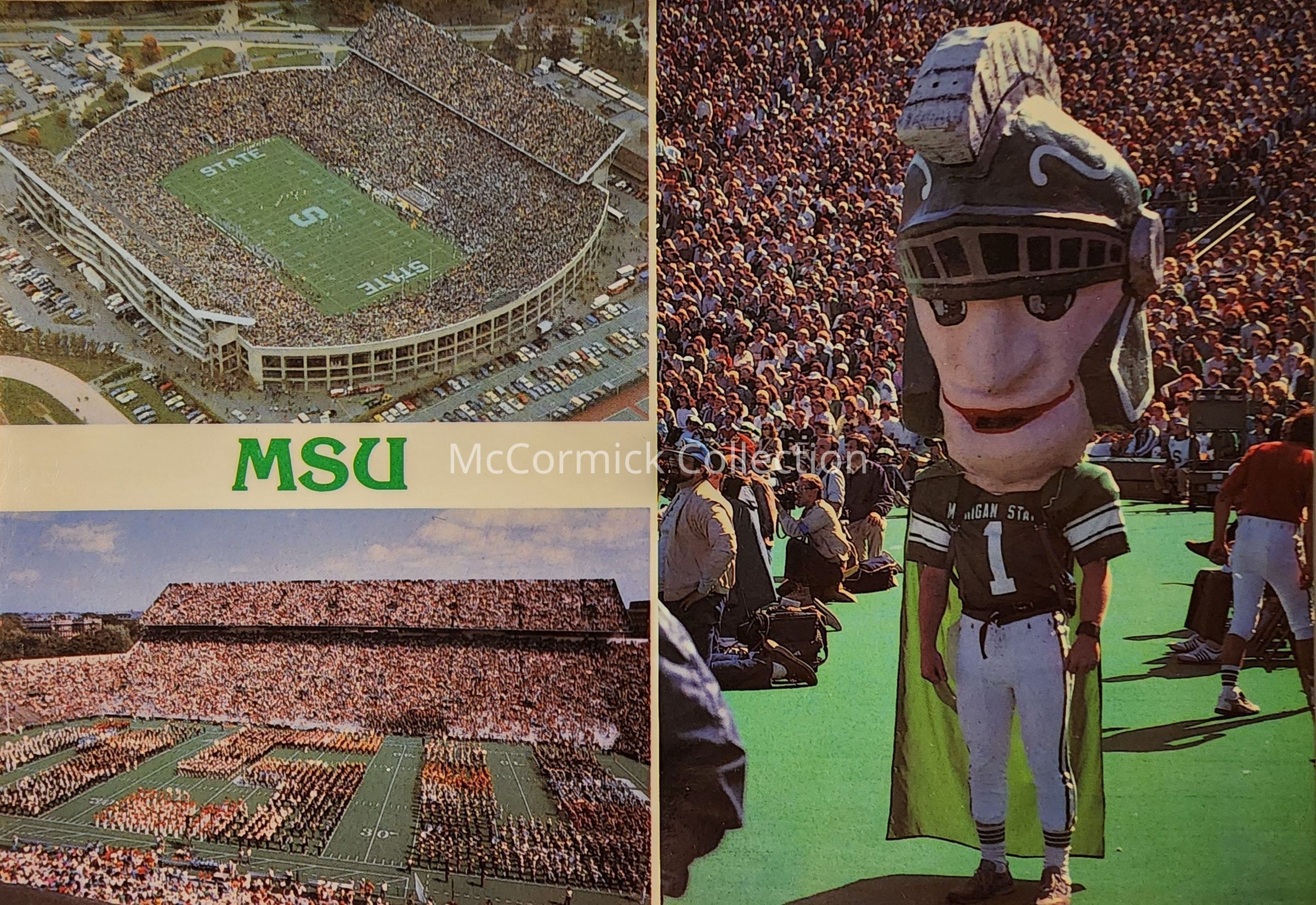 Shows an aerial, the Spartan Marching Band Band Day, and the Sparty mascot.