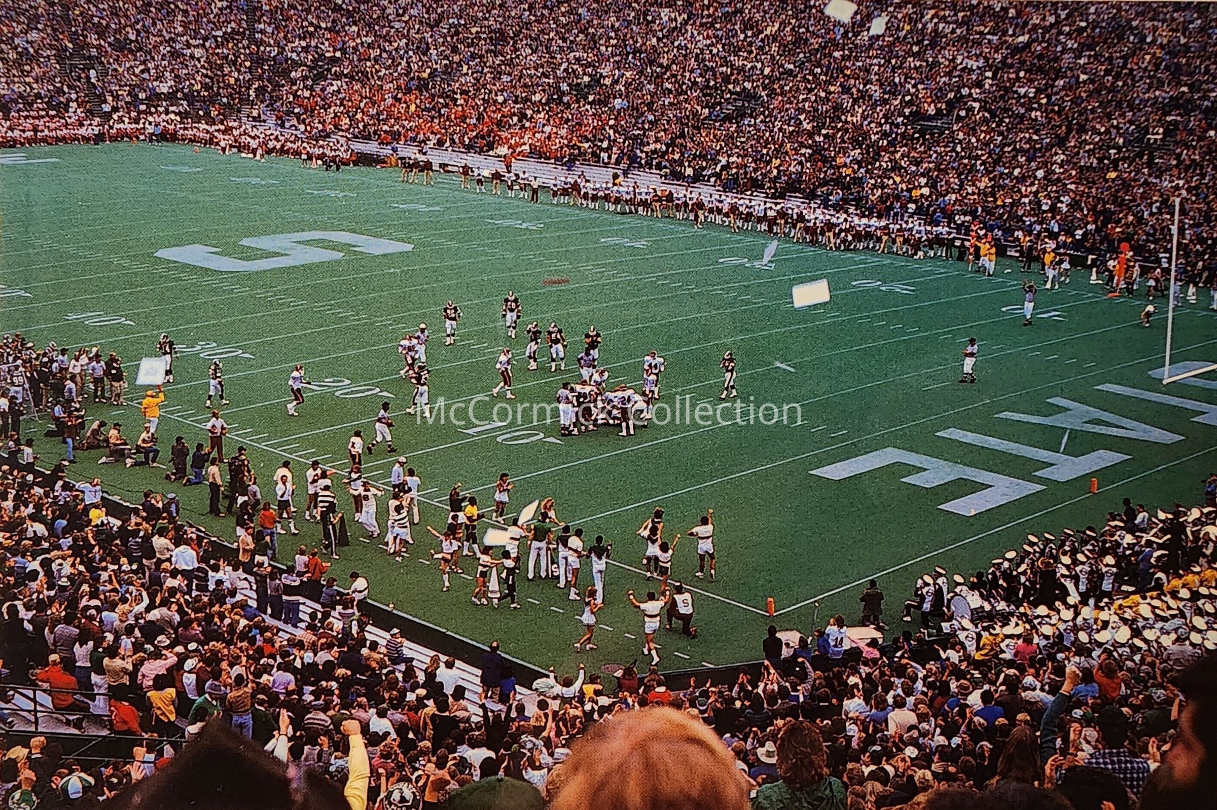 Shows stadium and Spartan Marching Band in the stands.