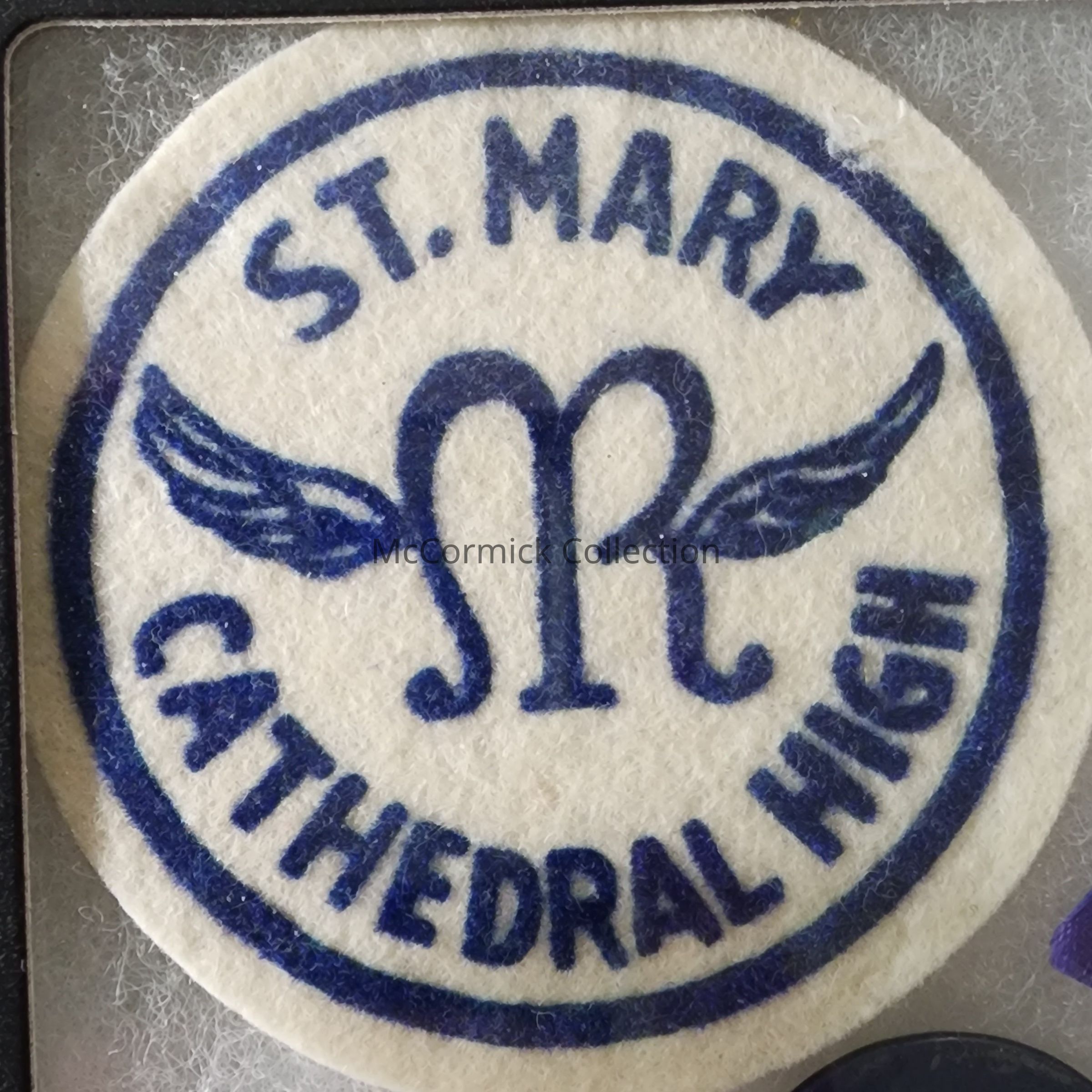 A round blue and white felt patch from St. Mary Cathedral High School in Lansing, Michigan.