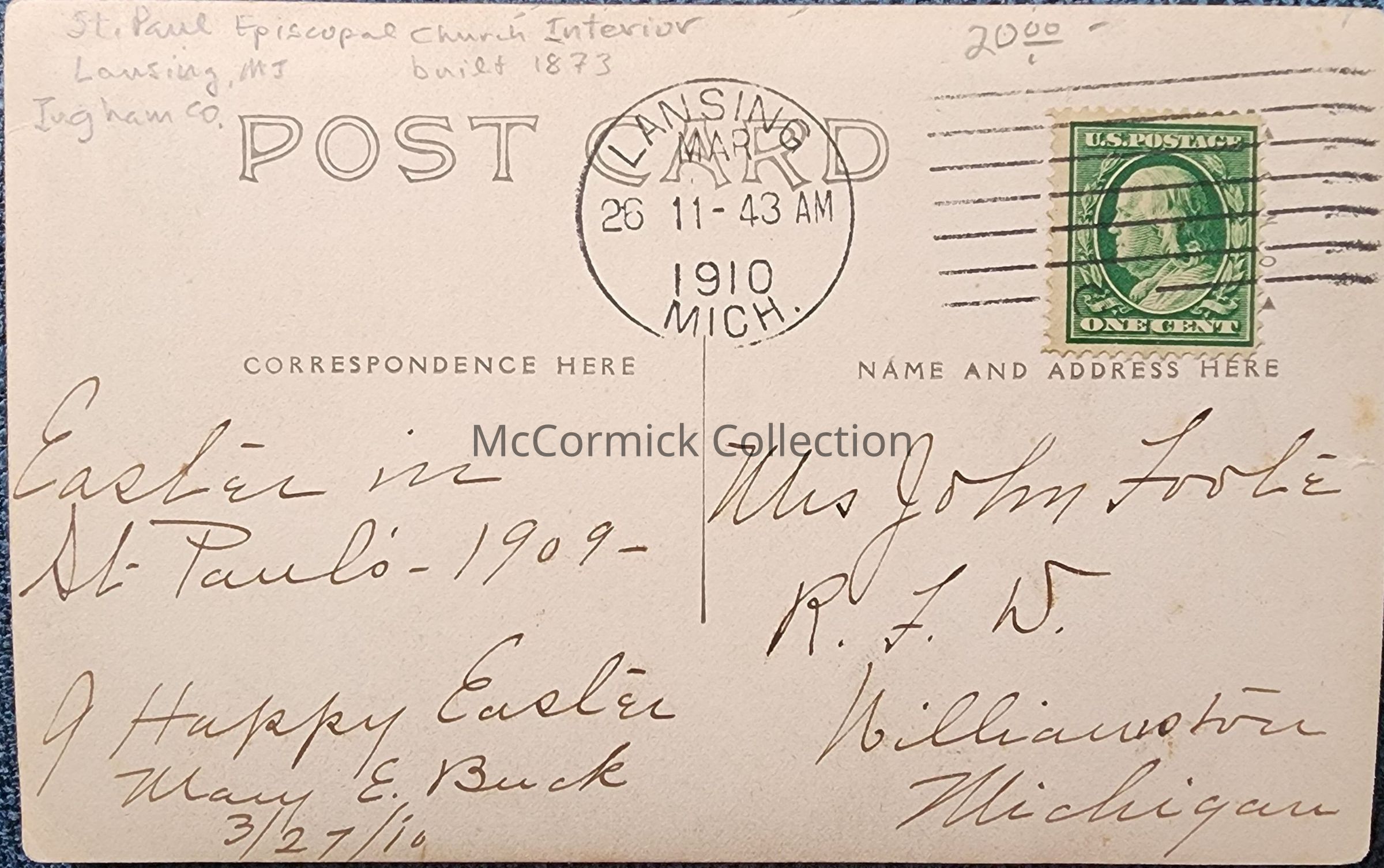 Real photo postcard of the interior of St. Paul's Episcopal Church of Lansing, Michigan. Postmarked Lansing 1910.