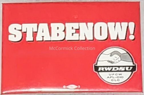 A red and white Rectangular political button for Debbie Stabenow for U.S. Senate, distributed by RWDSU - UFCW - AFL-CIO - CLC.