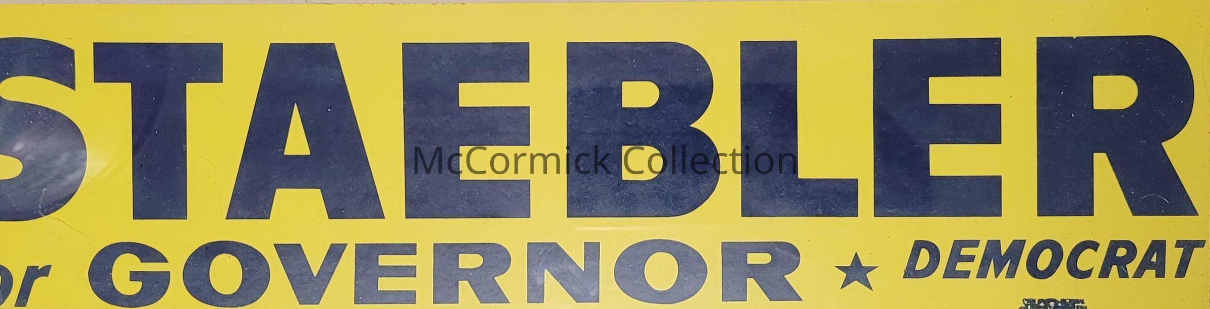 A yellow and black/blue bumper sticker for the 1964 gubernatorial campaign of Neil Staebler.
