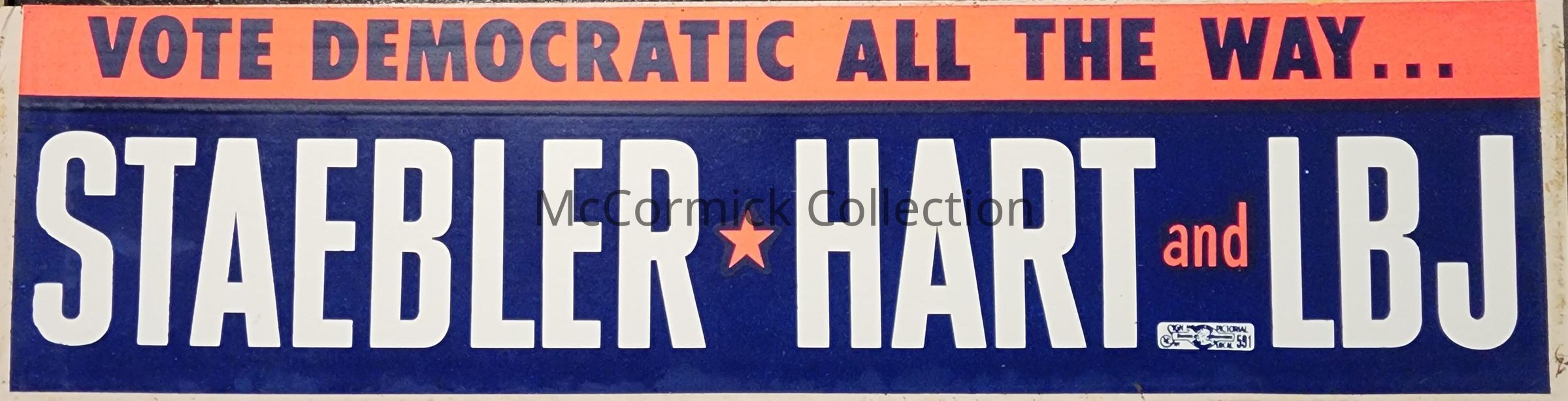 Coattail Bumper sticker for Neil Staebler for Governor, Phil Hart for U.S. Senate, and Lyndon B. Johnson for President, in 1964.
