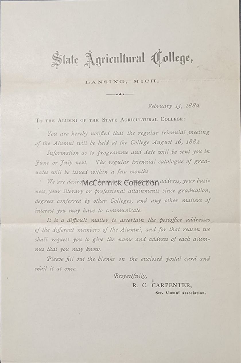 State Agricultural College Alumni Letter, 1882