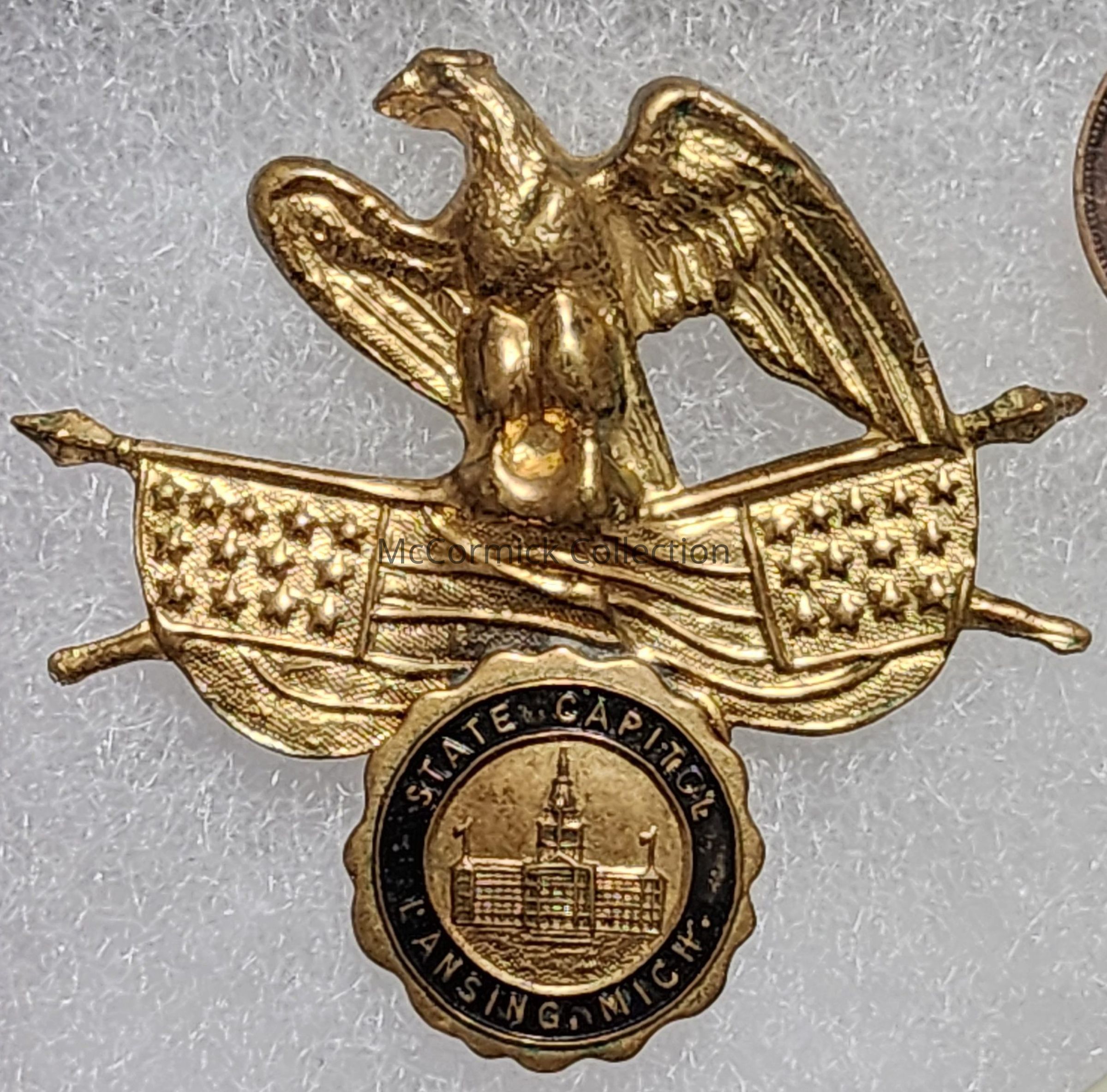 A gold badge with eagle and flags, and seal featuring an image of the Michigan State Capitol and words "State Capitol / Lansing, Mich."
