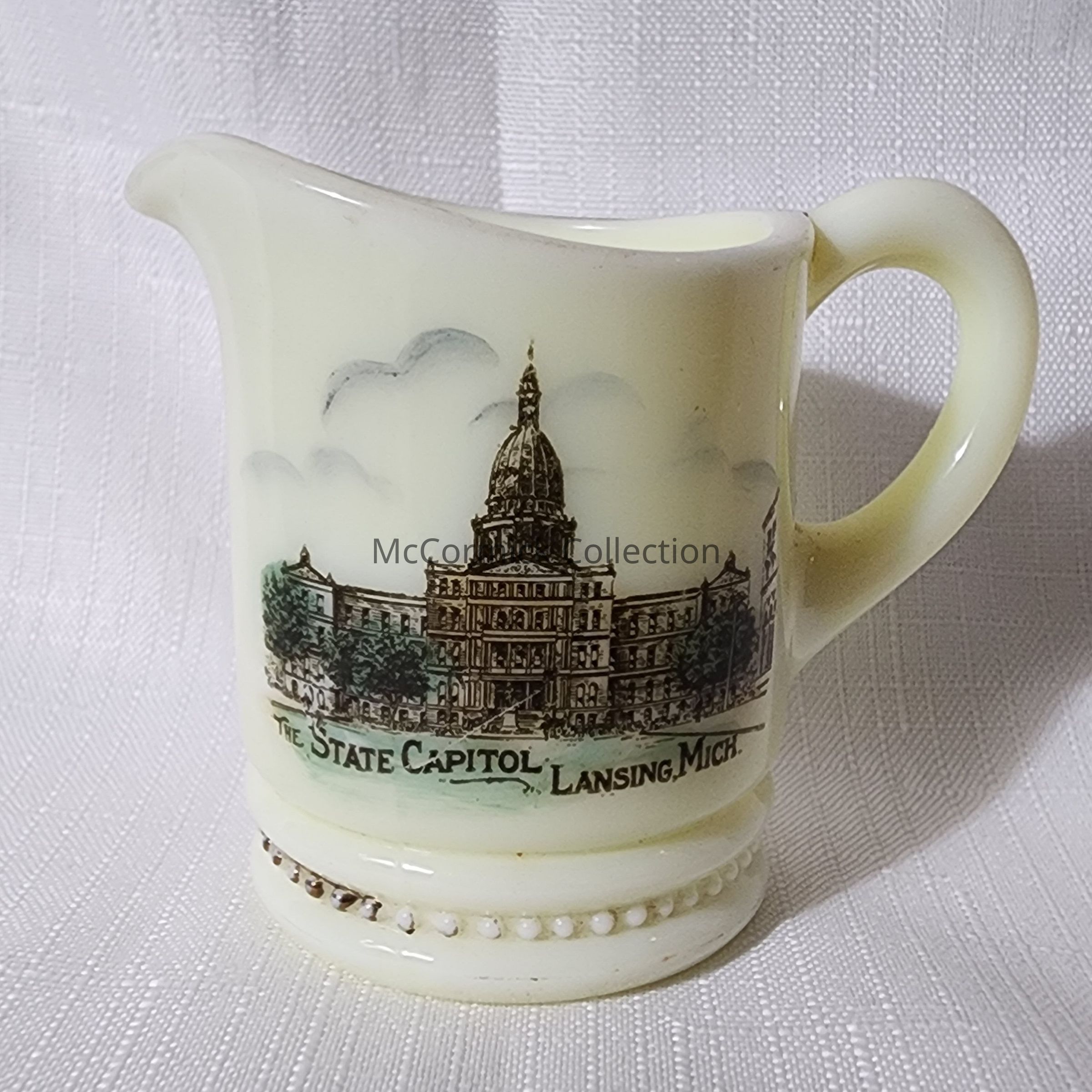 Custard Glass souvenir cup or creamer of the Michigan State Capitol in Lansing, Michigan.