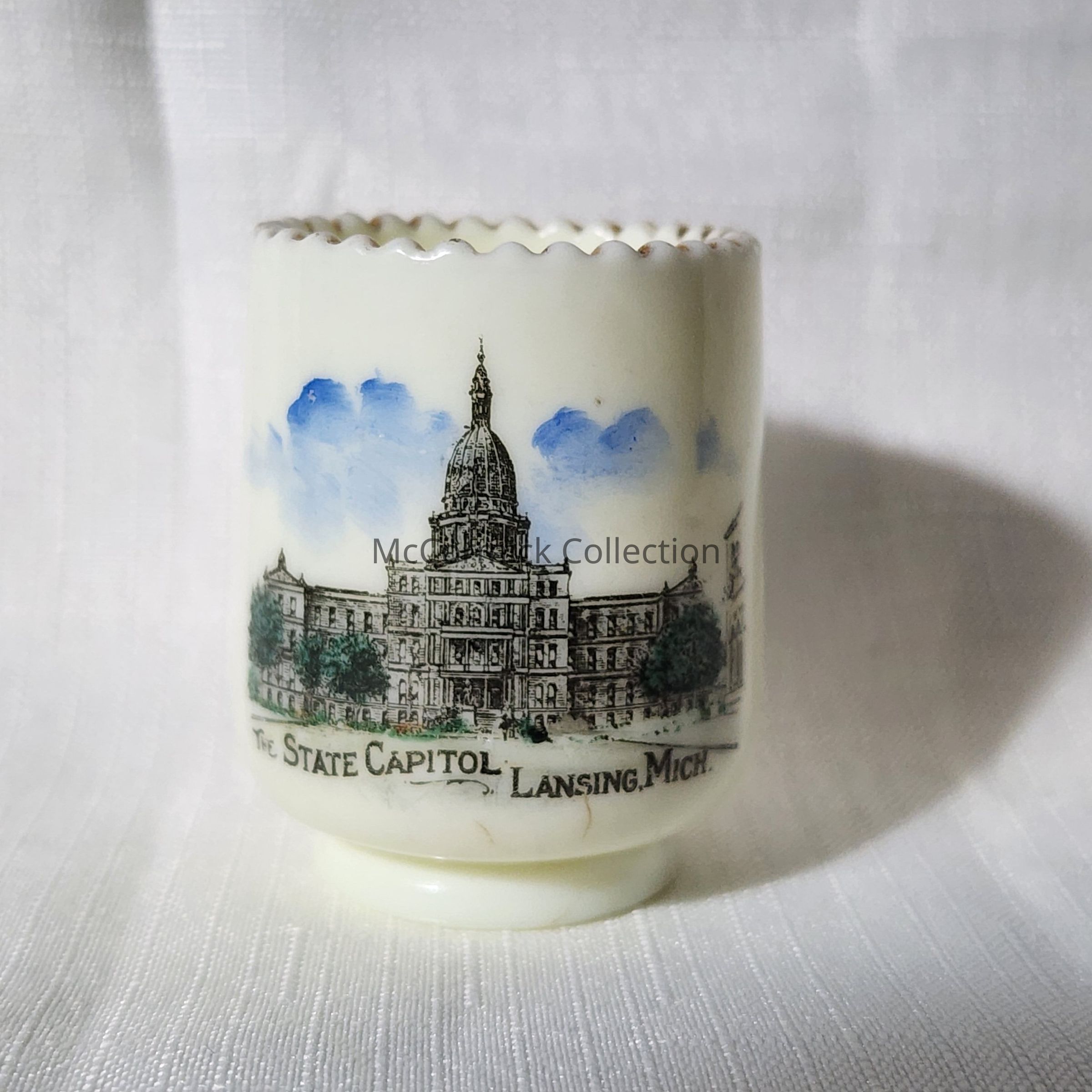 Michigan State Capitol custard glass toothpick holder.