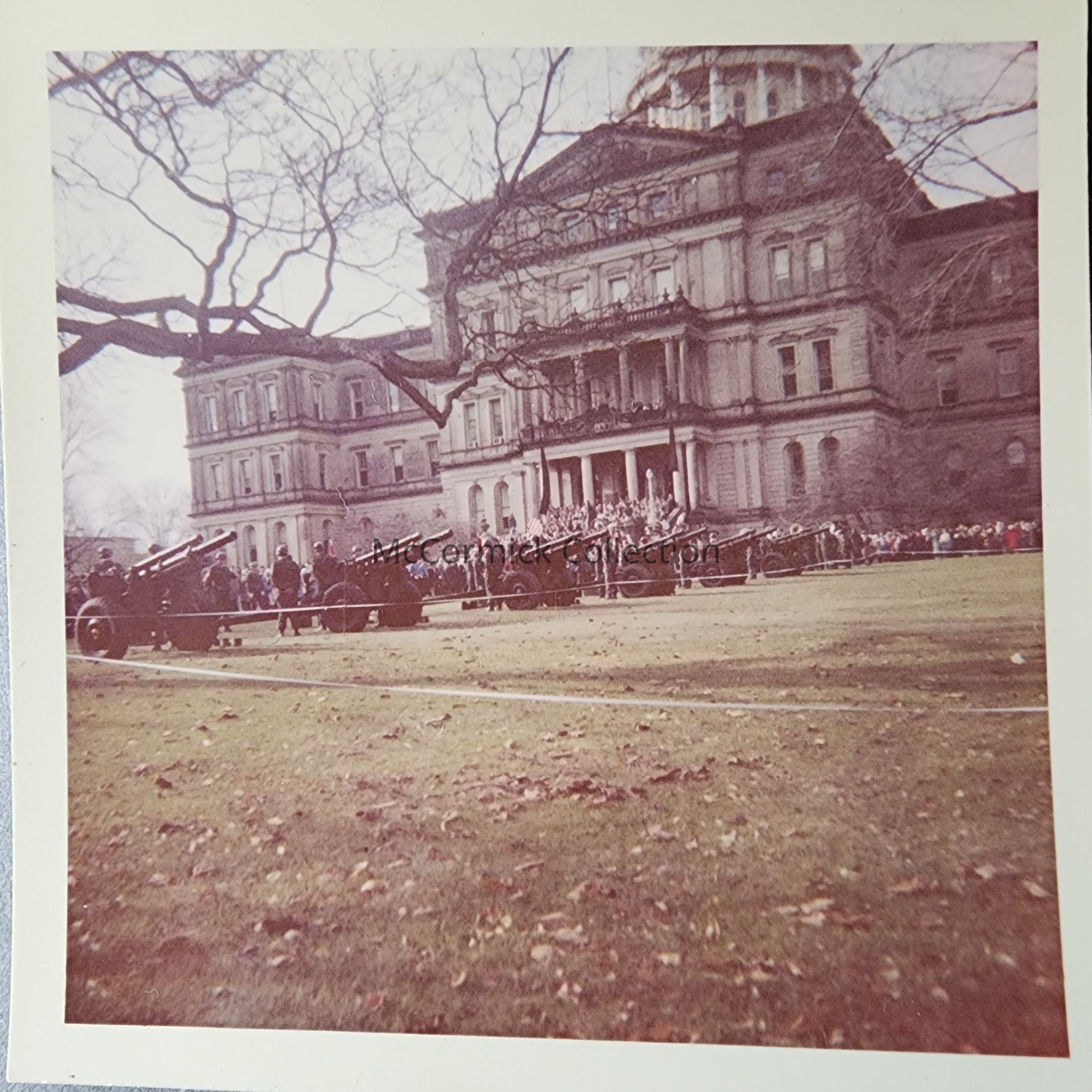 Snapshot photograph of an inauguration at the Michigan State Capitol in Lansing with cannons on the Capitol lawn. Circa 1960s.