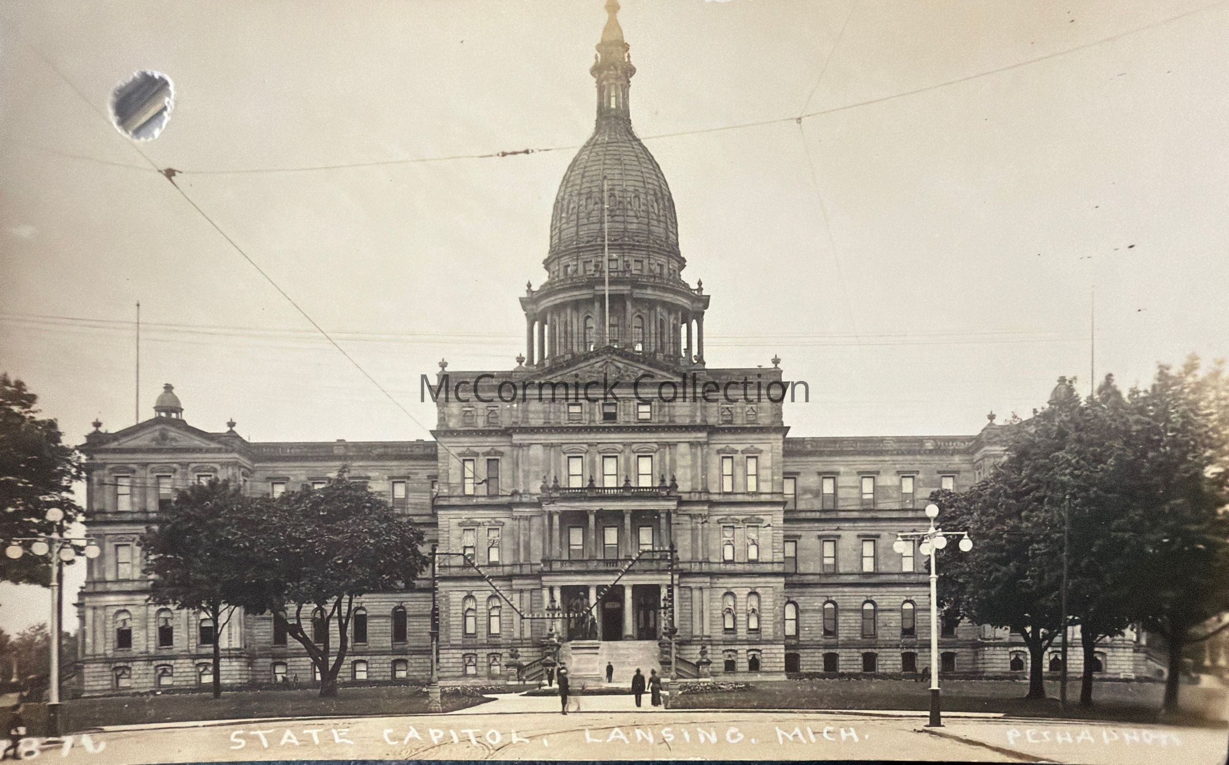 Real photo postcard of the Michigan State Capitol in Lansing by photographer Pesha. Postally unused. Removed from Pesha salesman sample, hole from brad.