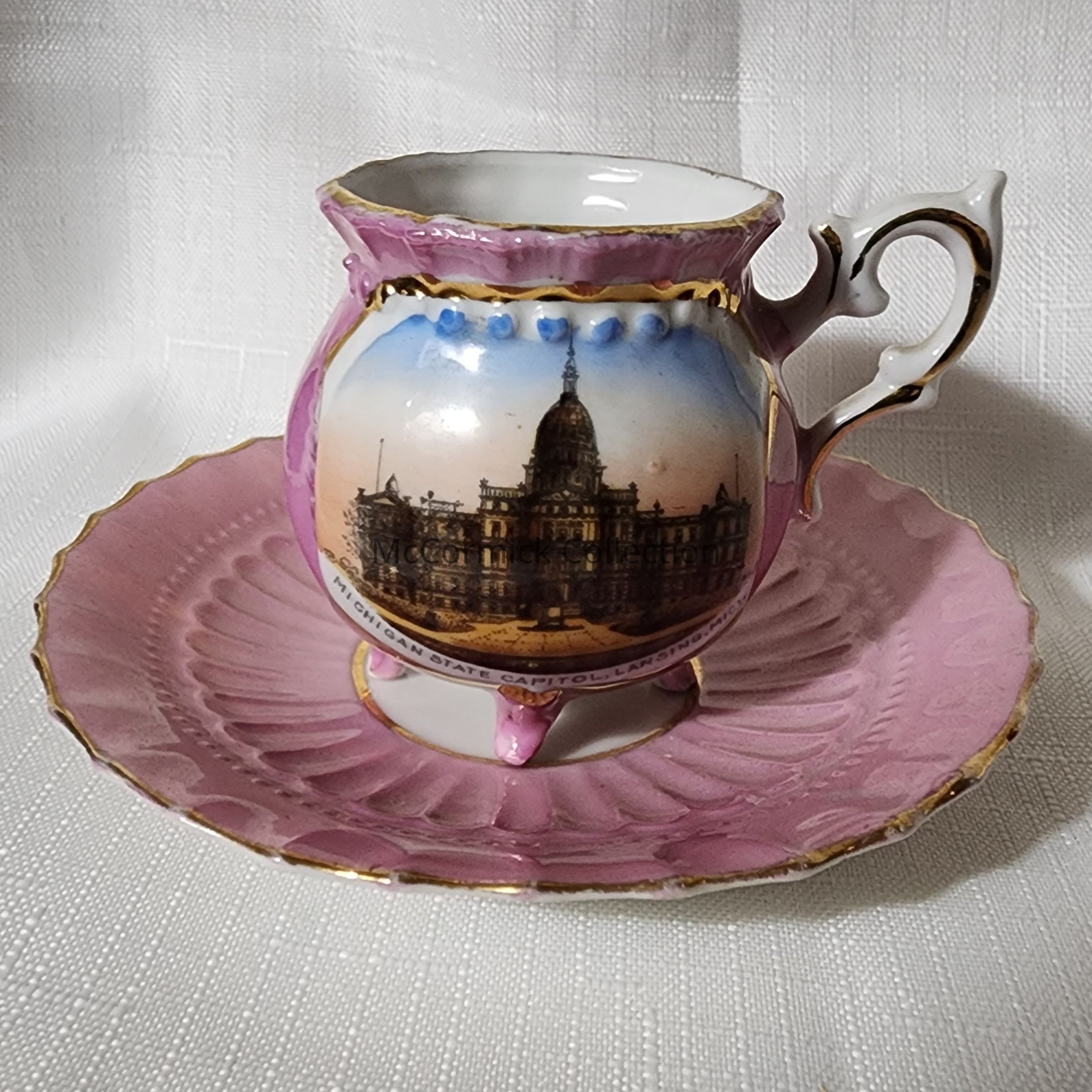 Porcelain souvenir cup or Demitasse and Saucer of the Michigan State Capitol in Lansing.