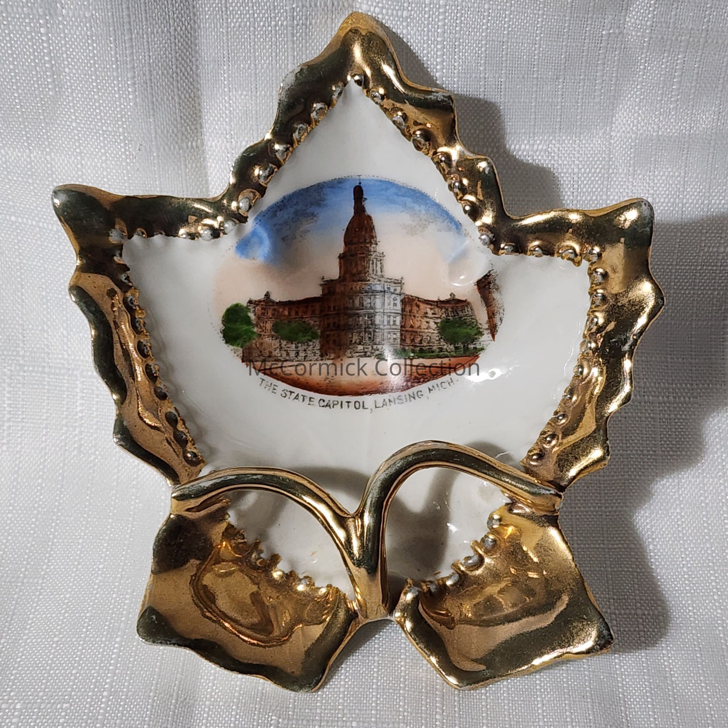 Michigan State Capitol porcelain souvenir dish in a leaf shape.